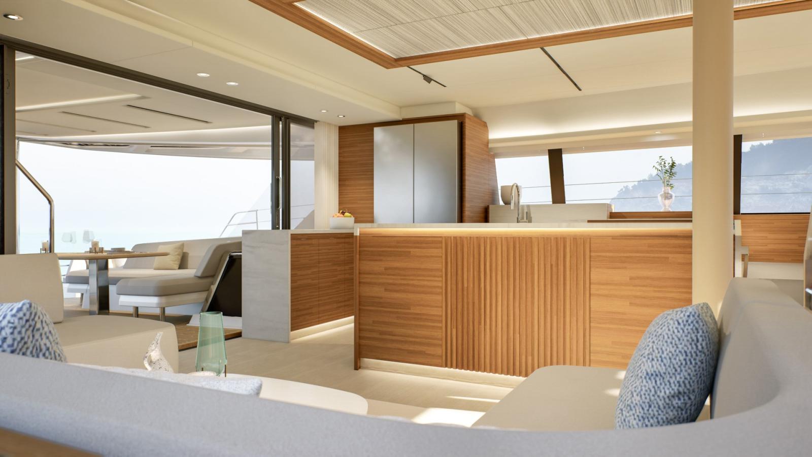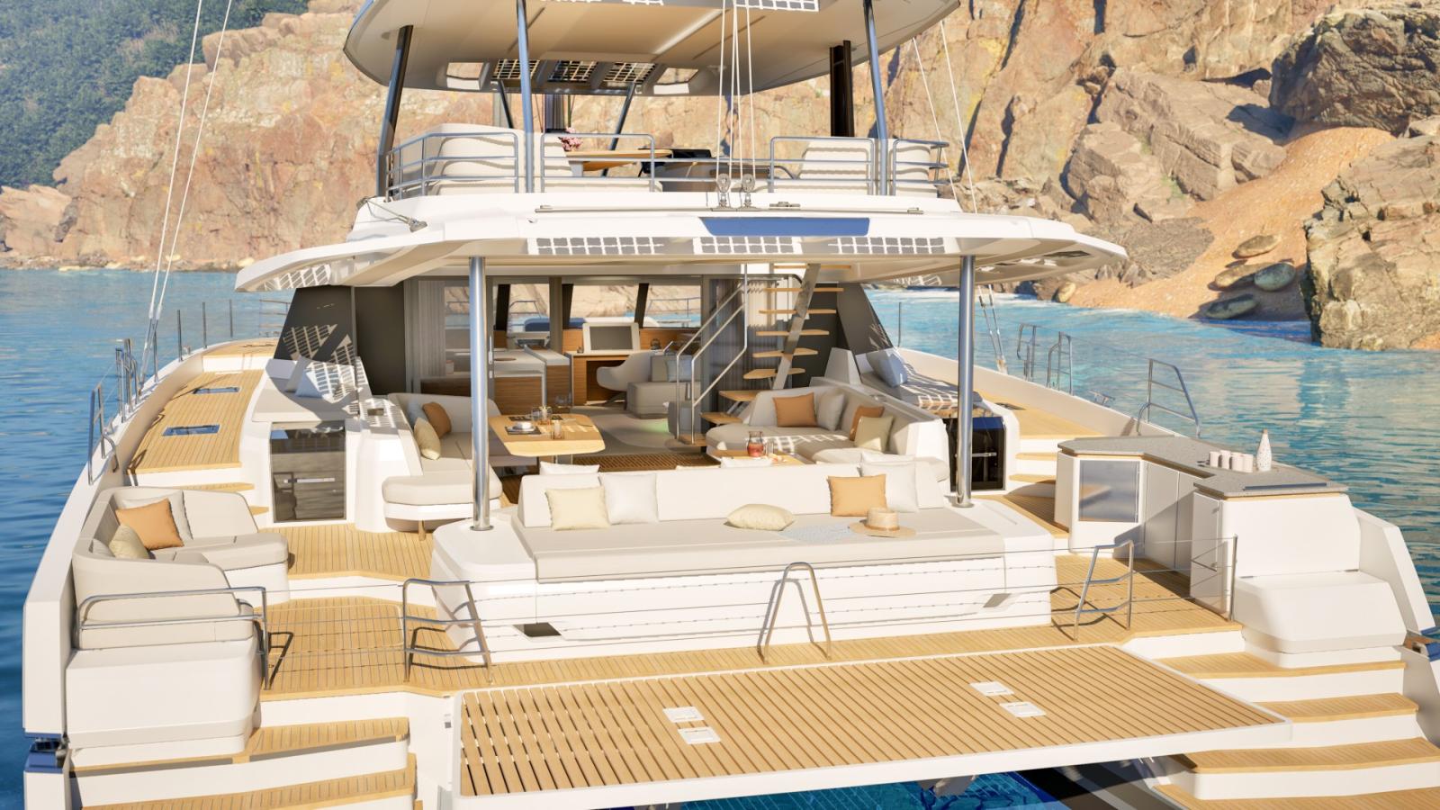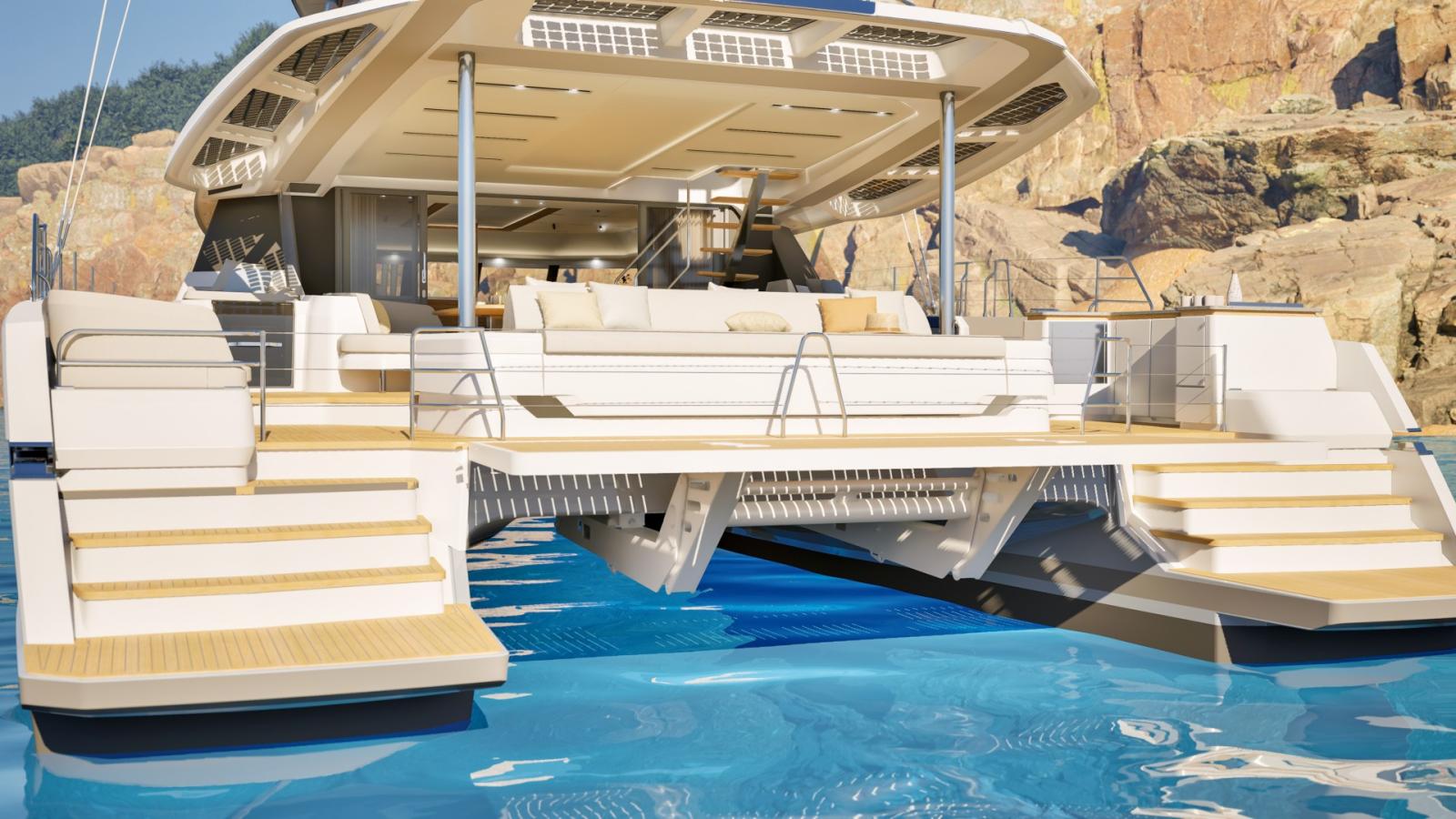 À l’arrière, le beach club devient un véritable espace de loisirs : solarium, plateforme de bain hydraulique et larges rangements pour les équipements nautiques. Chaque détail est pensé pour faire de la mer un espace de vie à part entière.