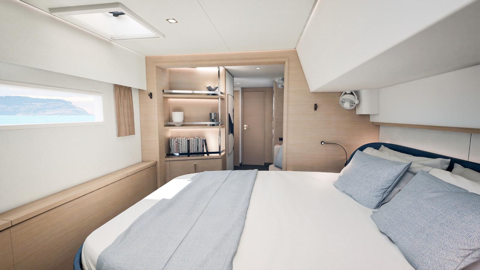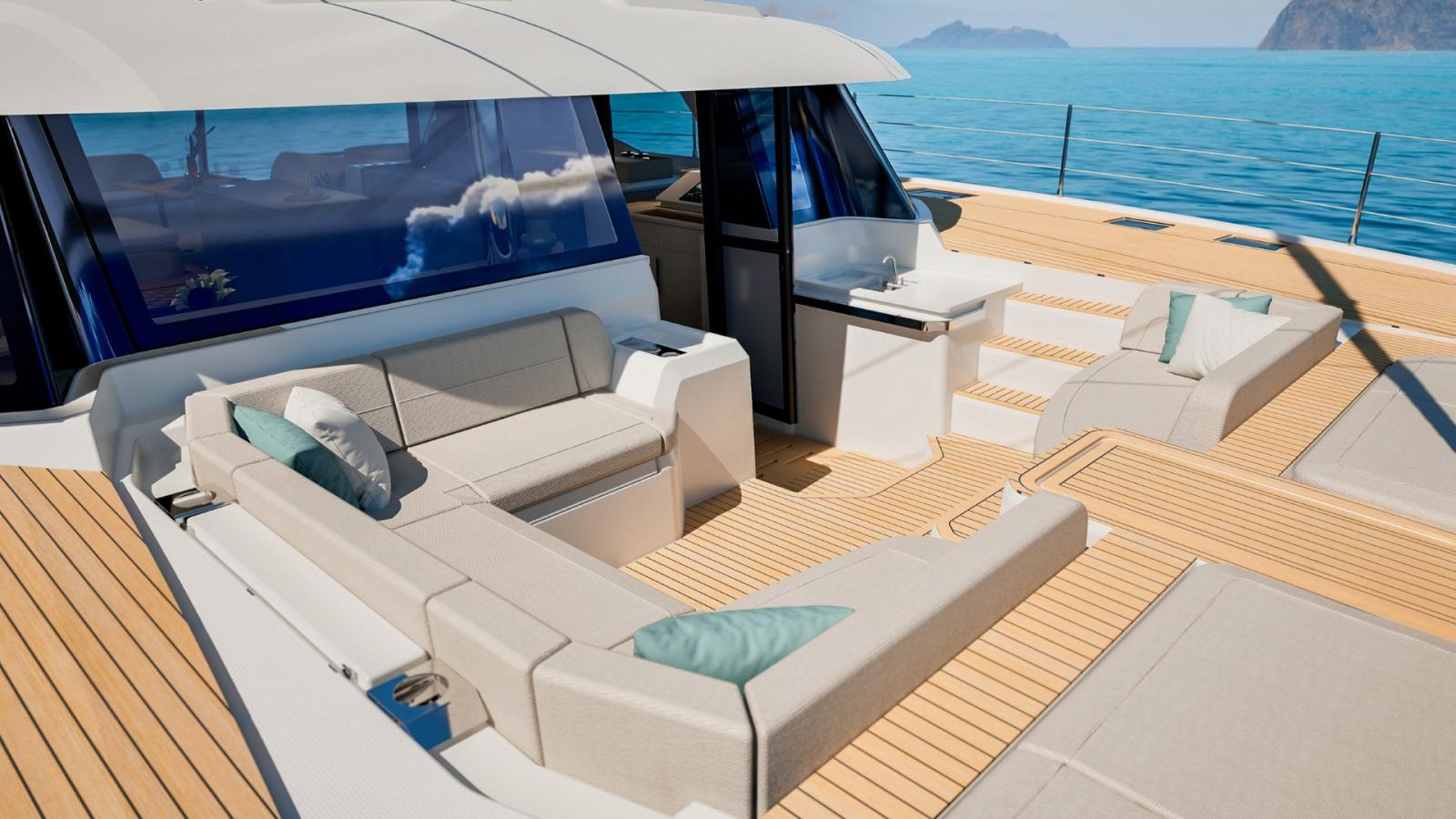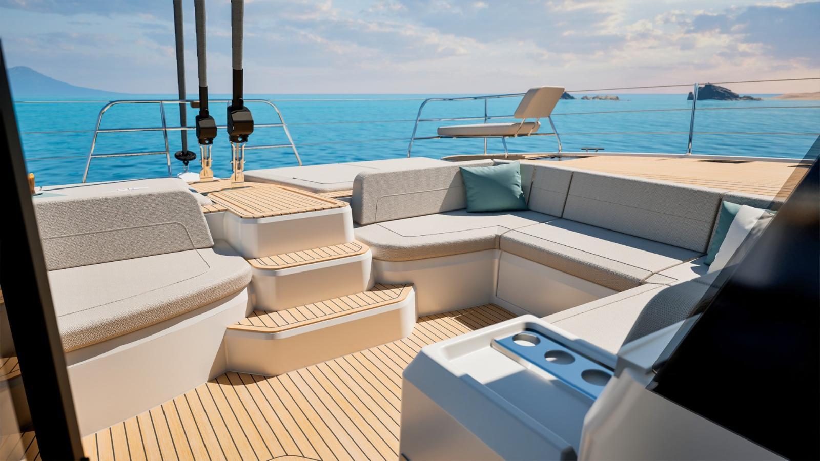 Avec ses 17 mètres de longueur, il offre des volumes généreux et une circulation fluide entre les espaces. Le carré lumineux profite d’une ventilation naturelle optimisée grâce à une large baie coulissante et à un accès direct vers le cockpit avant — une conception jusqu’ici réservée aux modèles emblématiques de la marque.