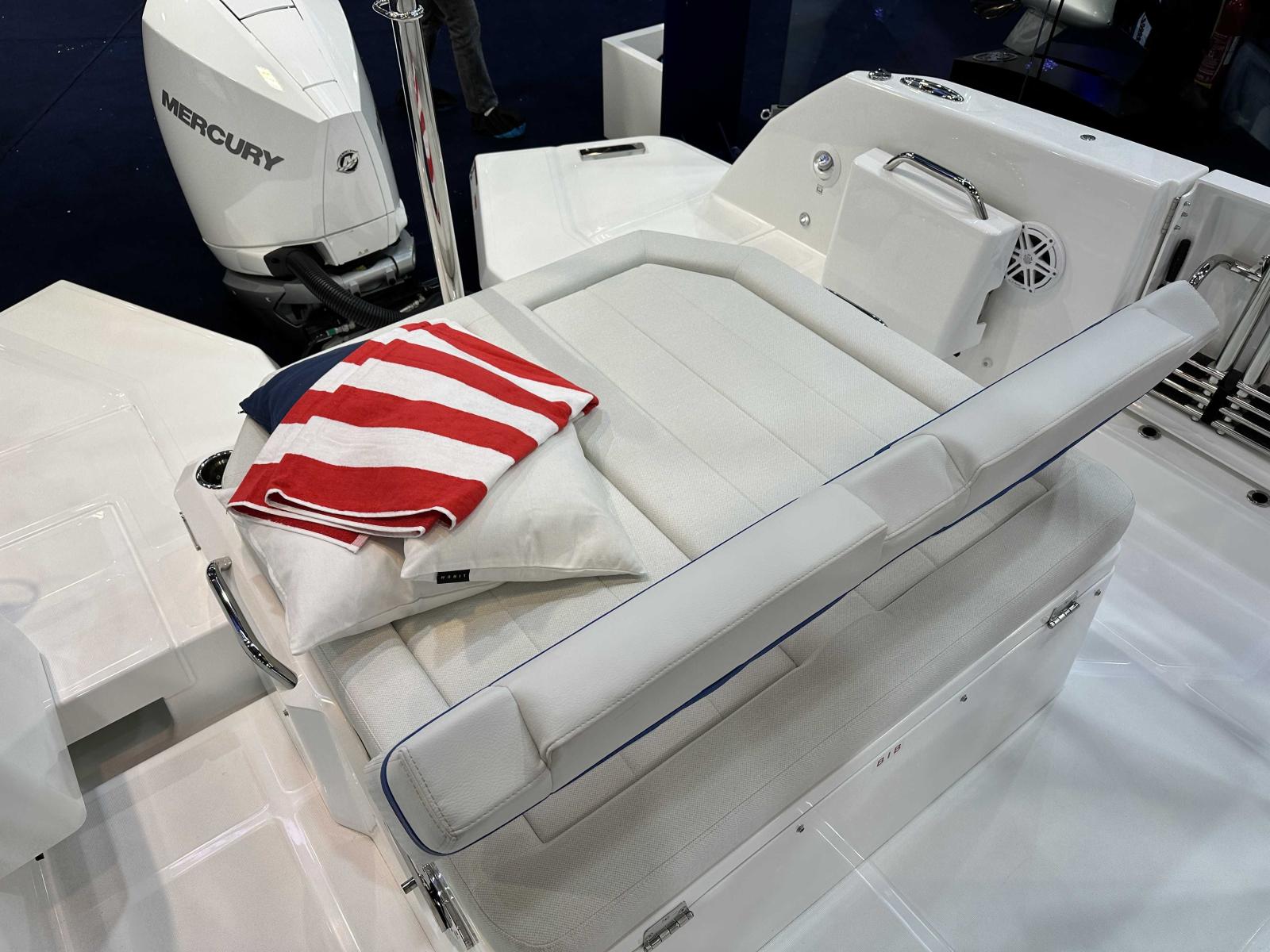 Wellcraft 28 T-Top coque bleue, Mercury 300 XXL V8 blanc, T-Top avec pare-brise haut, sellerie de cockpit Desert, finition Première, pack cabine avant, pack eau douce, pack ancre, pack électronique Garmin, pack audio Fusion, 2 taquets centraux additionnels, housse de protection, mât de ski amovible, table avant et coussin Desert, propulseur d’étrave, 2 barres LED sur T-Top, BBQ gaz, réfrigérateur 51 L, flaps électriques et toit manuel ouvrant.