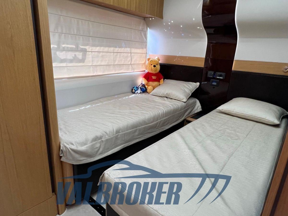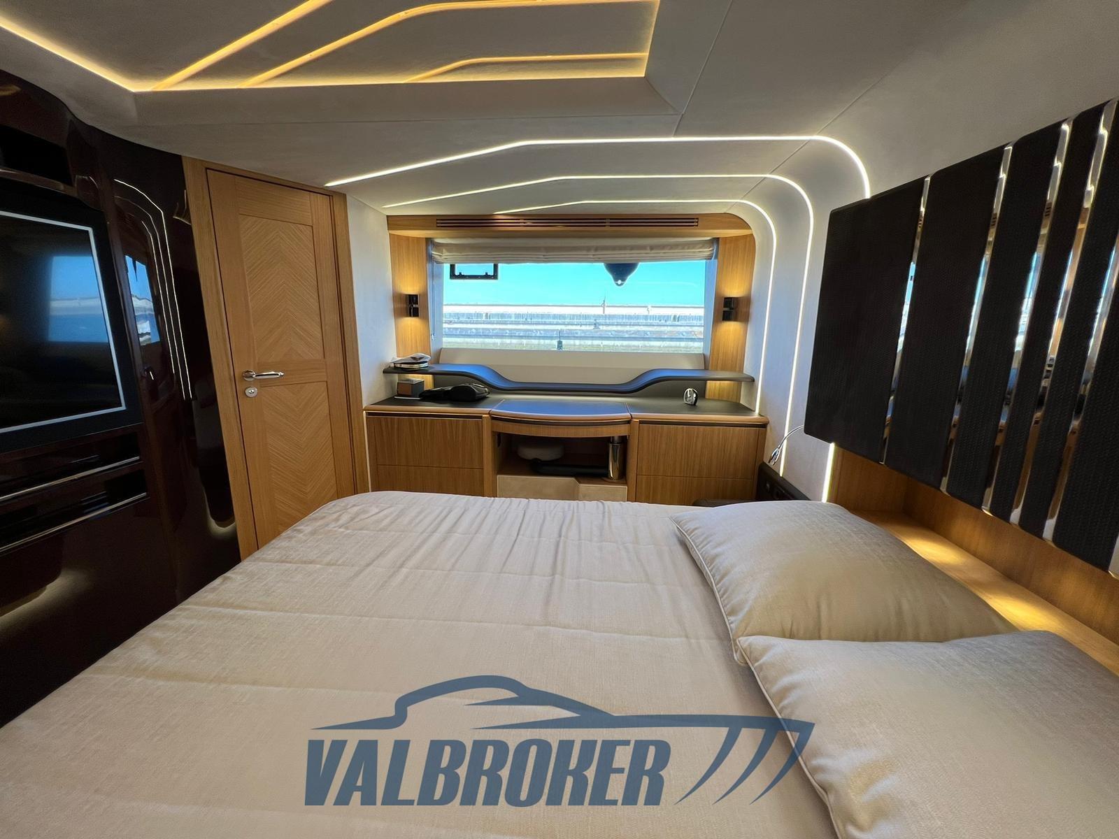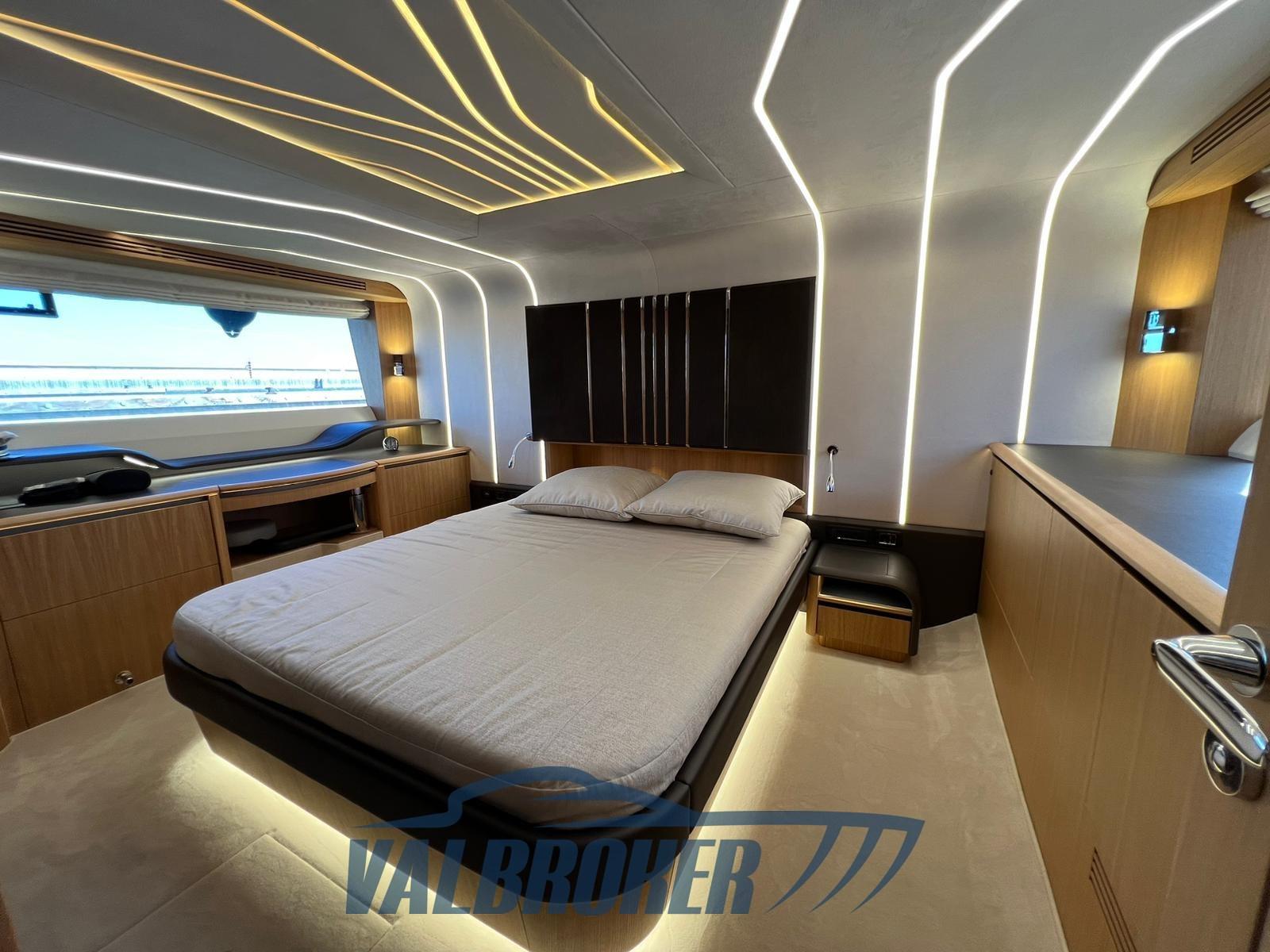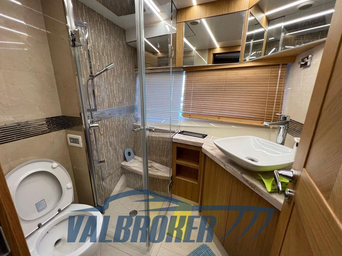 Une cabine principale pleine largeur avec sa propre salle de bain attenante a une entrée séparée du salon. La cabine VIP est située à l’avant et deux cabines doubles équipées, l’autre avec salle de bain privée. Le toit rigide est équipé d’une capote à commande électrique pour permettre le soleil/l’ombre.