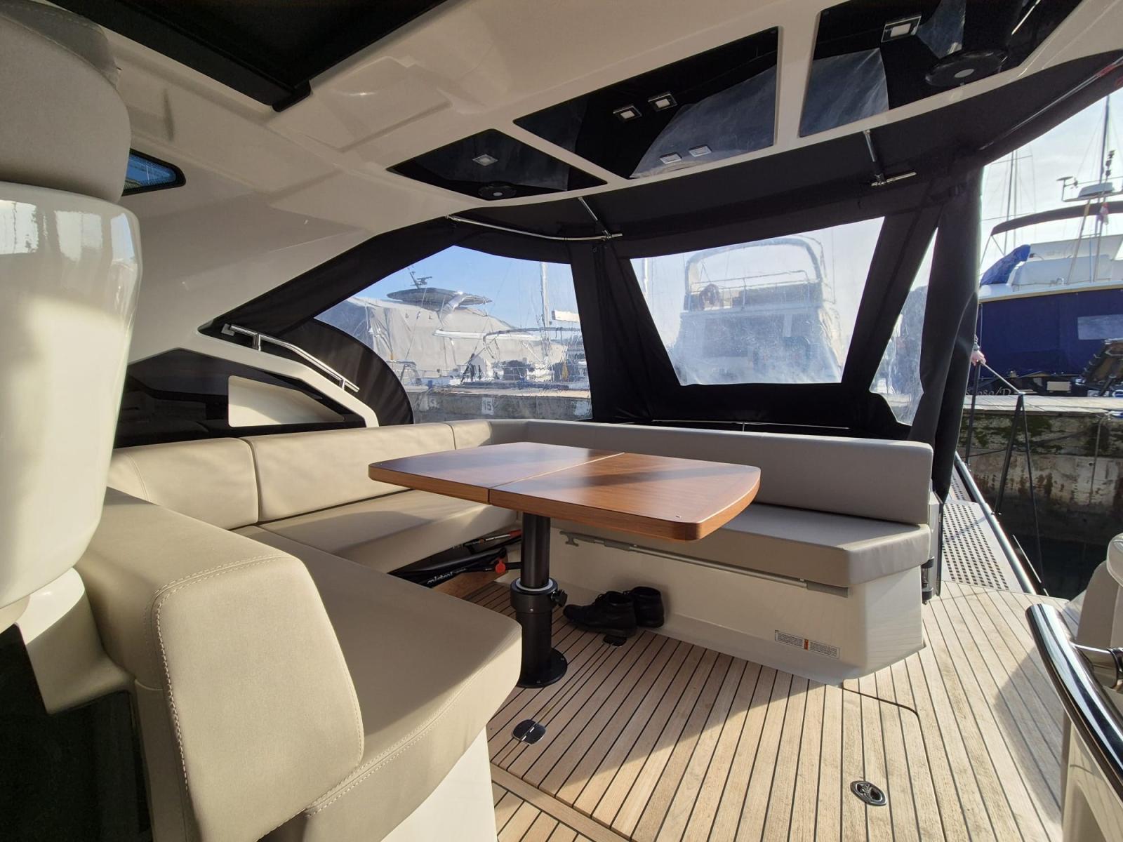 Alarme moteur, Alarme de pompe de cale, Ancre (21 kg, Ultramarine), Batteries (engine and service), Douche de cockpit, Propulseur d'étrave (with automatic fire extinguisher), Flaps électriques, Garage à annexe, Hard top (fiberglass, with large opening electric roof), Extincteur(s) fixe(s), Éclairage de courtoisie, 3 Spots sous-marins, 6 Défenses (with fender covers), Passerelle (hydraulic, 3 m, 3 steps), Plateforme arrière, Cockpit en teck, Prise de quai, Connexion eau sous pression à quai, Echelle de bain, table de cockpit, Pont en teck, Winch (anchor winch with remote control).