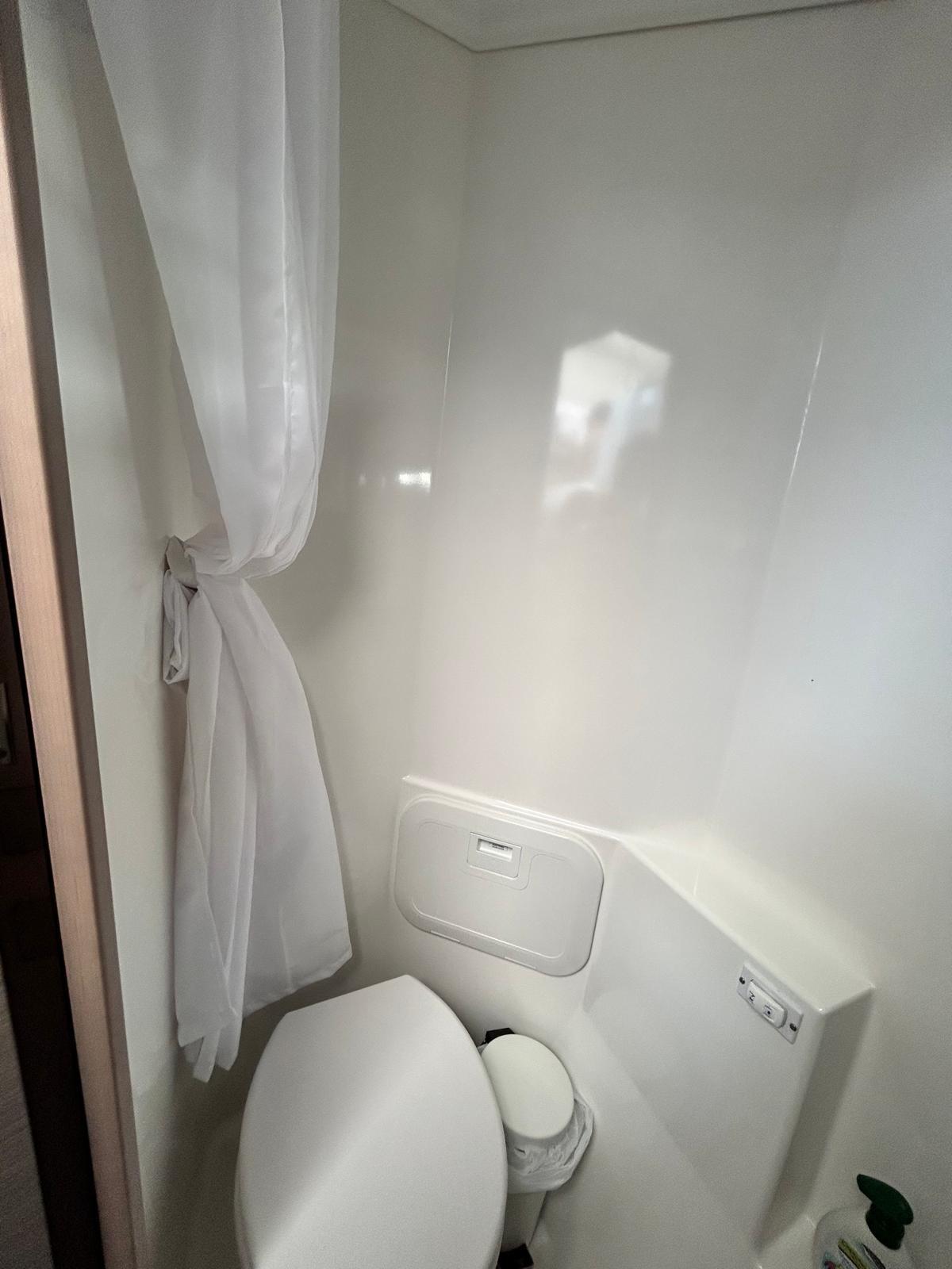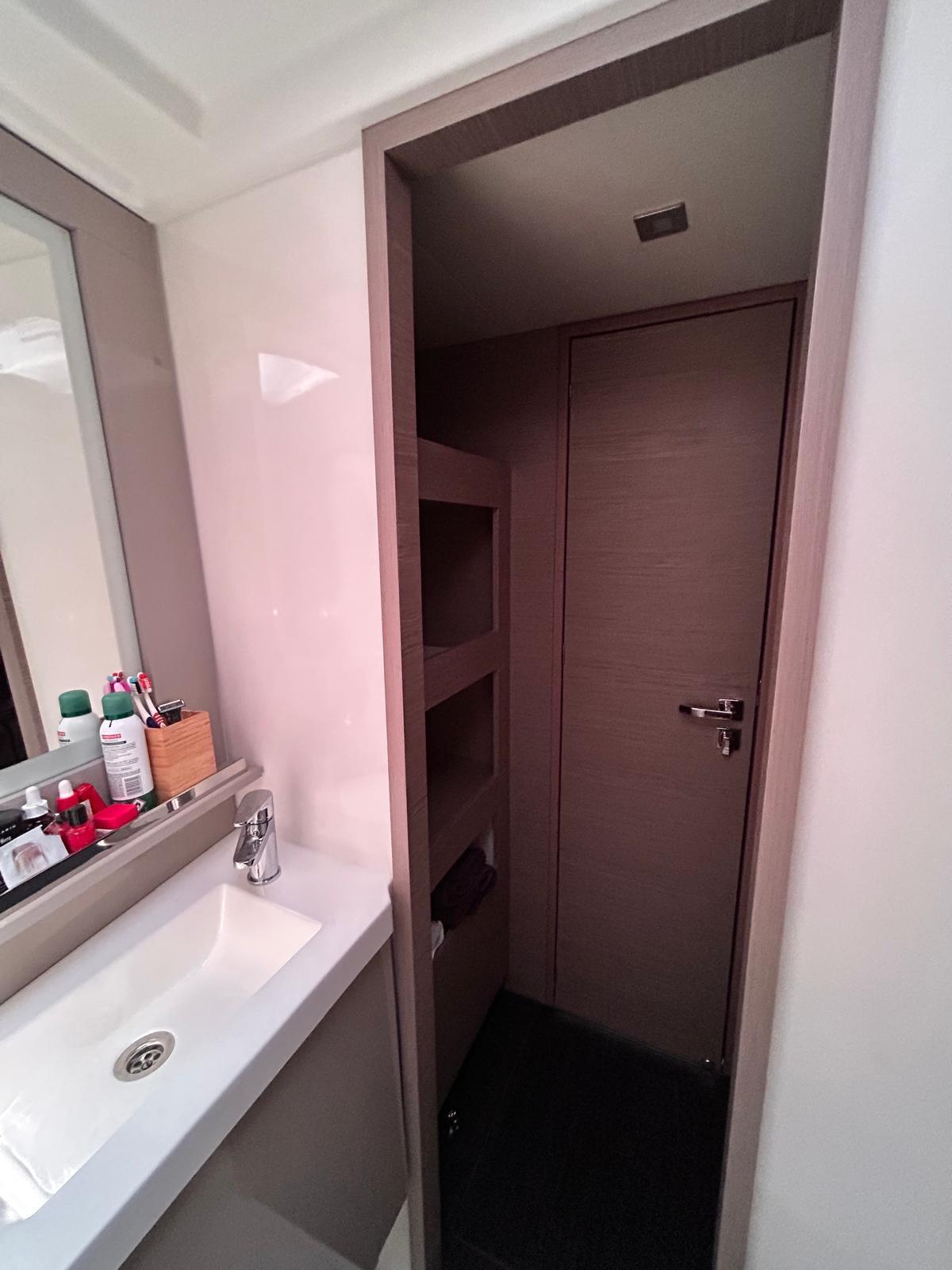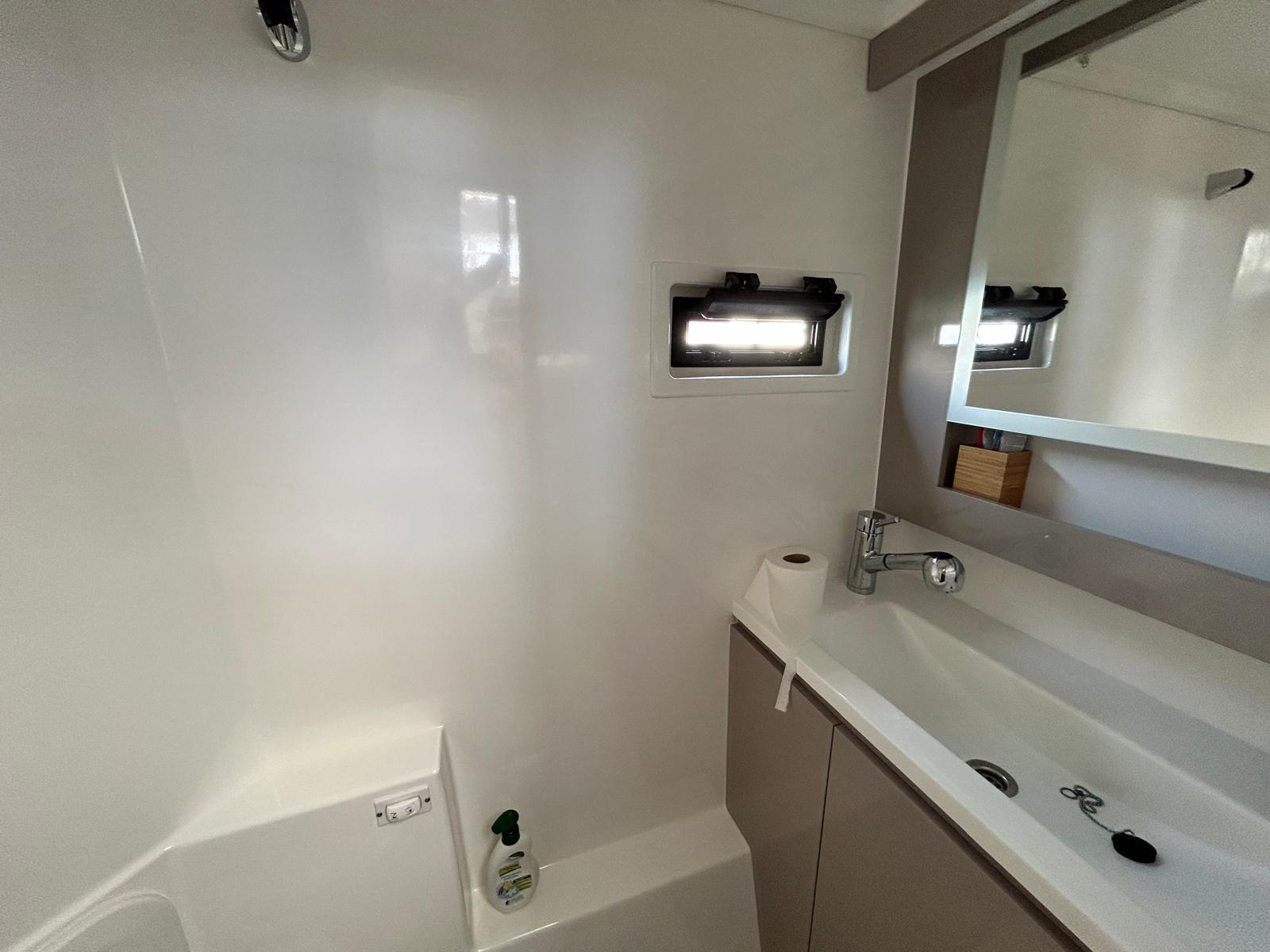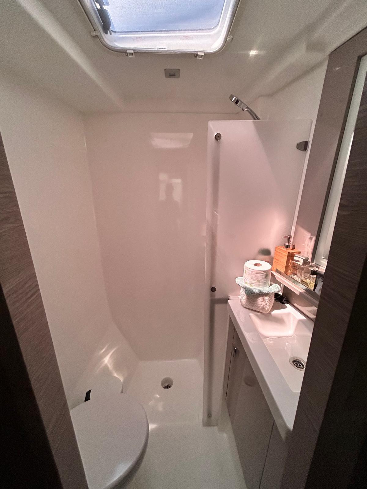 Salle de bain d’invités tribord avec lavabo, toilettes électriques à eau fraîche et douche à mains