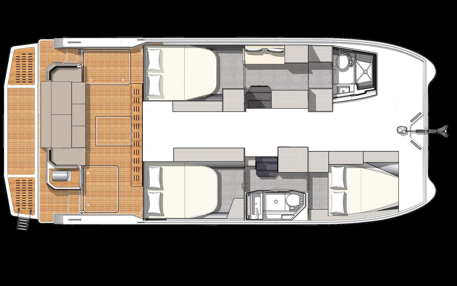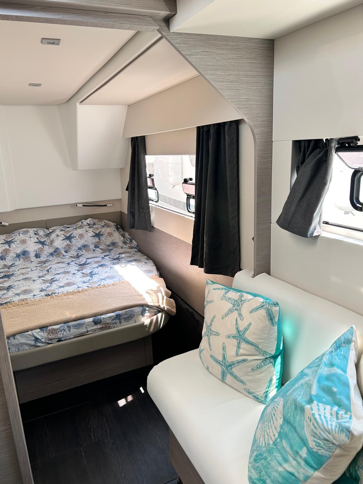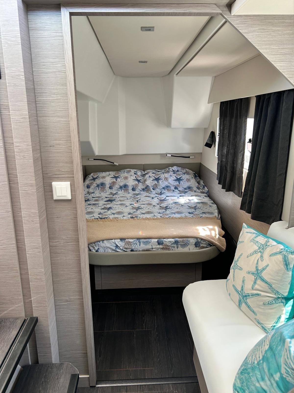 Cabine principale côté bâbord avec lit double, armoire, canapé sur le côté et salle de bain privée à l’avant avec lavabo, toilettes électriques et cabine de douche
