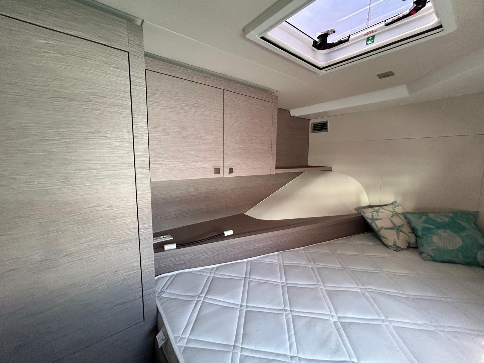Cabine avant avec lit double, armoire et meuble suspendu