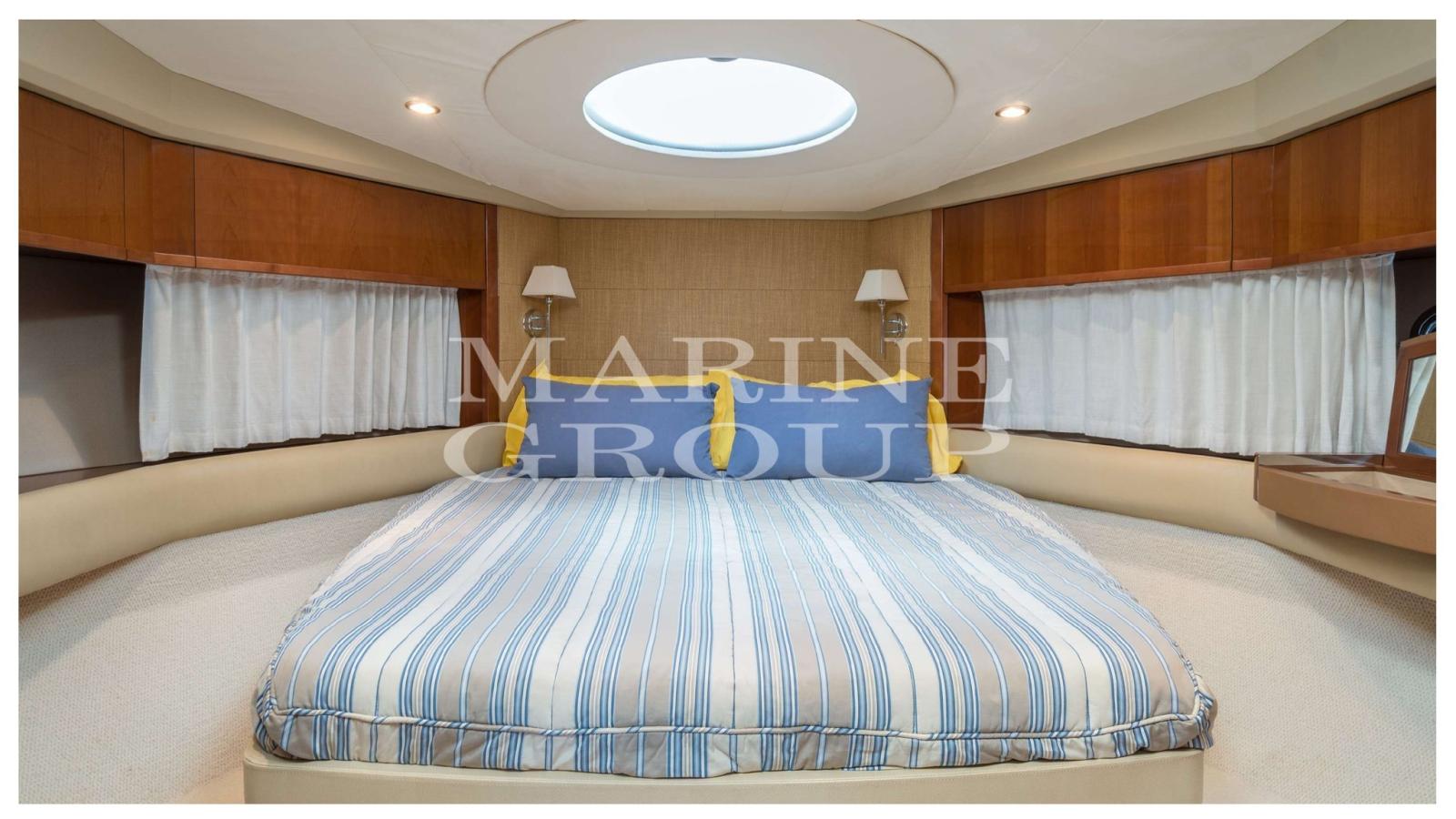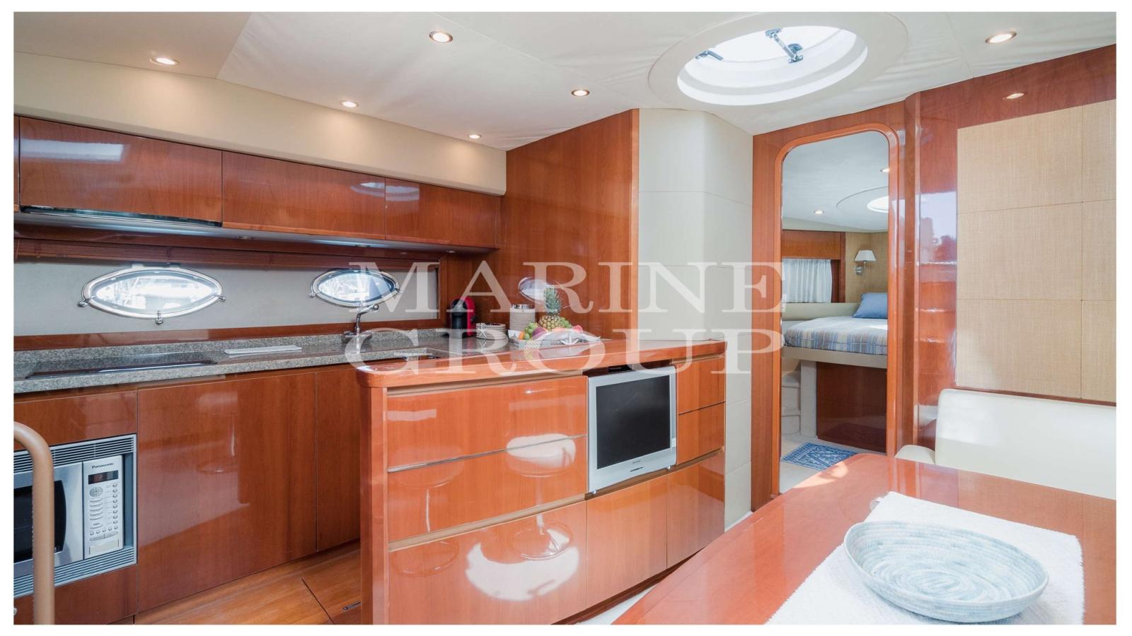 Intérieurs en bois de cerisier clair brillant ; parquet en chêne ; Grande dînette avec canapé en forme de « C » et table centrale ; Cuisine entièrement équipée en forme de « L » ; Cabine principale à l’avant avec salle de bain attenante ; Cabine arrière avec deux lits simples au sol ; Deuxième cabine arrière avec lits simples superposés ; Deuxième salle de bain avec cabine de douche.