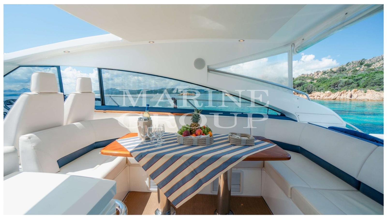 Couleur spéciale (blu), Douche de cockpit, Flaps hydrauliques, Garage à annexe, Hard top, Lavabo dans le cockpit, Éclairage de courtoisie, Passerelle, Plateforme arrière, Porte latérale, Cockpit en teck, Prise de quai, Connexion eau sous pression à quai, Guindeau électrique, Echelle de bain, table de cockpit, Corne.