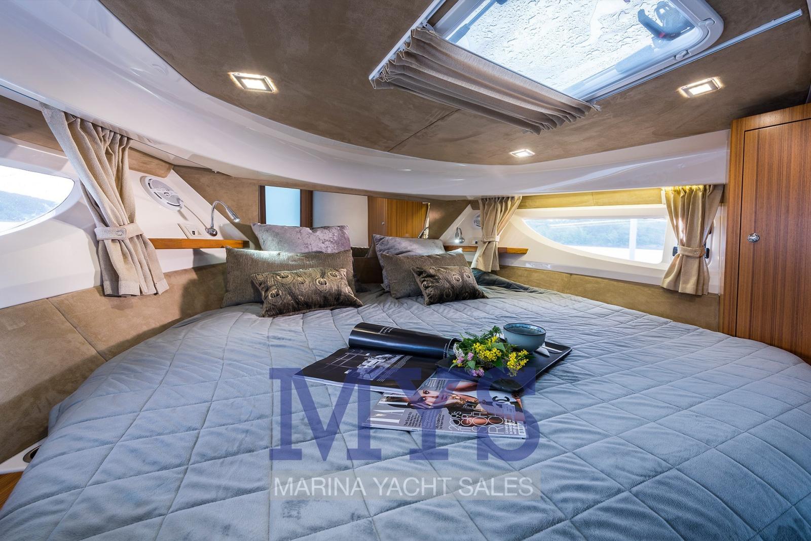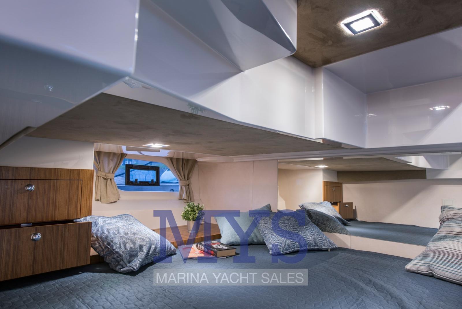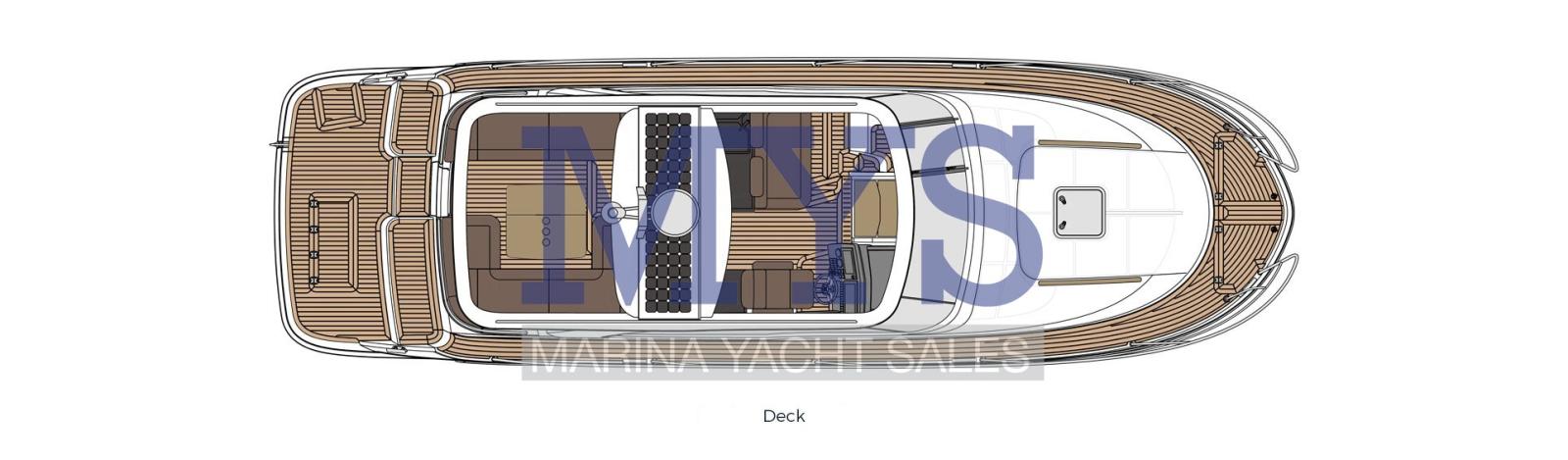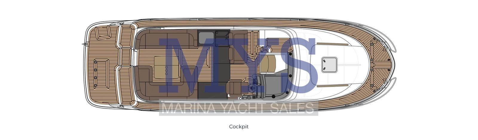 Alarme gaz, Eau sous pression, Flaps électriques, Hard top, Indicateurs de flaps, Éclairage de courtoisie, Plateforme arrière (Fissa in teak), 2 Pompe de cale automatique, Pompe de cale manuelle, Porte latérale, Prise de quai, Guindeau électrique, Echelle de bain, table de cockpit.