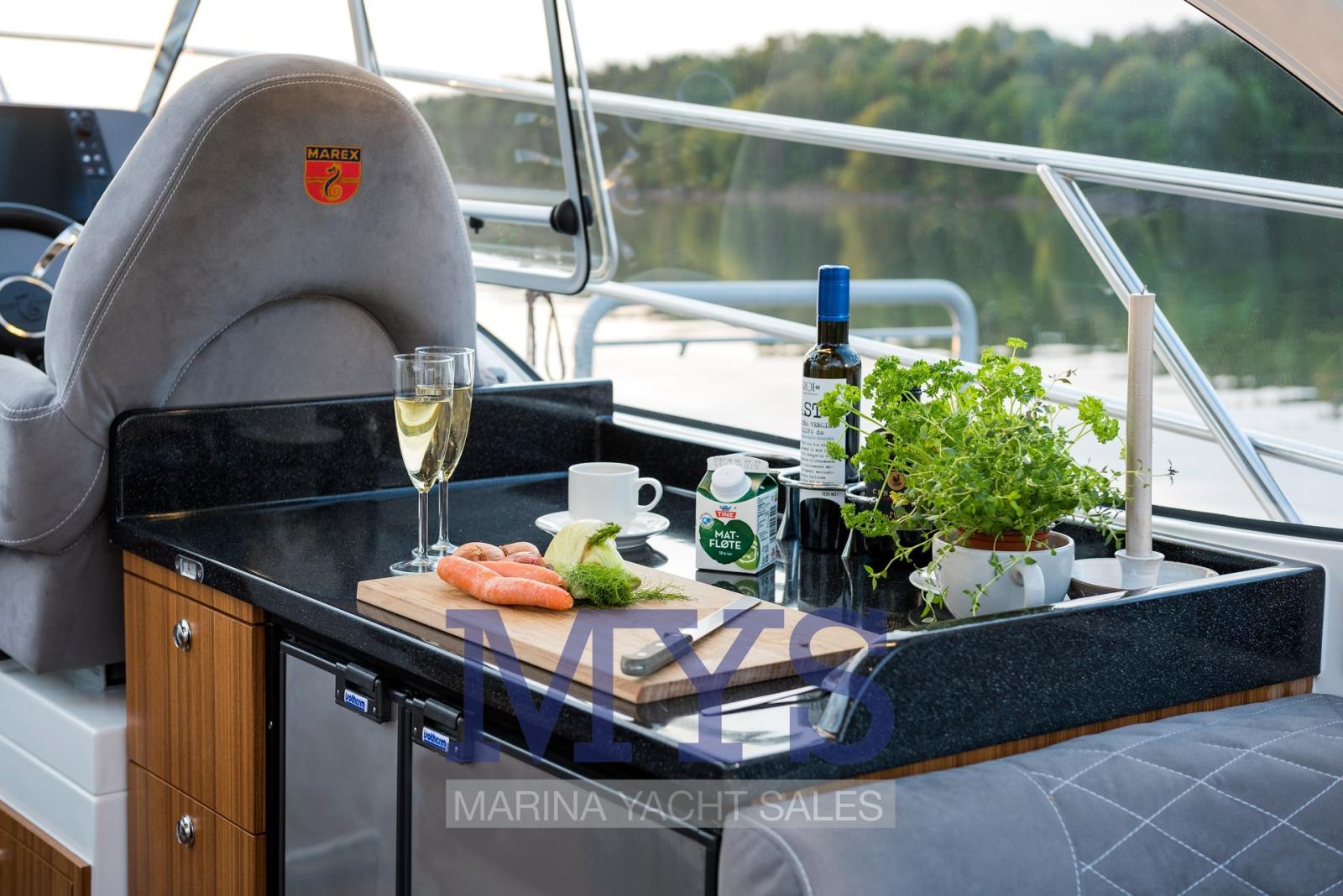 UNE PORTE PRATIQUE DANS LE PARE-BRISE PERMET UN ACCÈS RAPIDE, SÛR ET FACILE AU PONT AVANT, LES GRANDS PASSAGES LATÉRAUX DE 28 CM FACILITENT ÉGALEMENT LA CIRCULATION DANS LE BATEAU. UNE POSITION DE PILOTAGE BIEN CONÇUE, UNE EXCELLENTE ERGONOMIE DU TABLEAU DE BORD ET UNE INSTRUMENTATION CLAIRE ASSURENT UN CONFORT DE CONDUITE, TANDIS QUE LE GRAND SIÈGE TRIPLE COPILOTE GARANTIT UNE EXPÉRIENCE PASSIONNANTE POUR TOUTE LA FAMILLE.