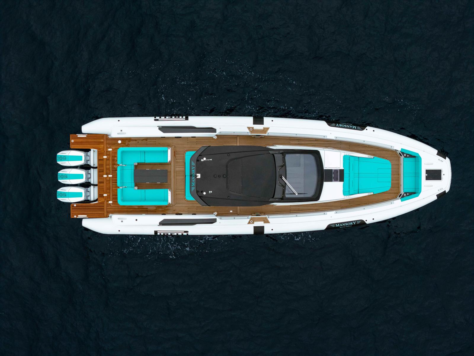 Motorisé par 3 x 600 CV Mercury Verado V12 avec pilotage joystick JPO, le PIRELLI 50 MANSORY délivre des performances de très haut niveau, alliées à une navigation fluide et maîtrisée.