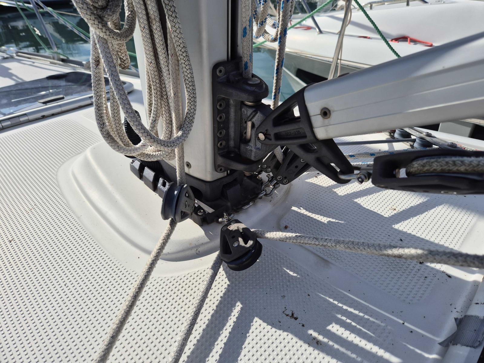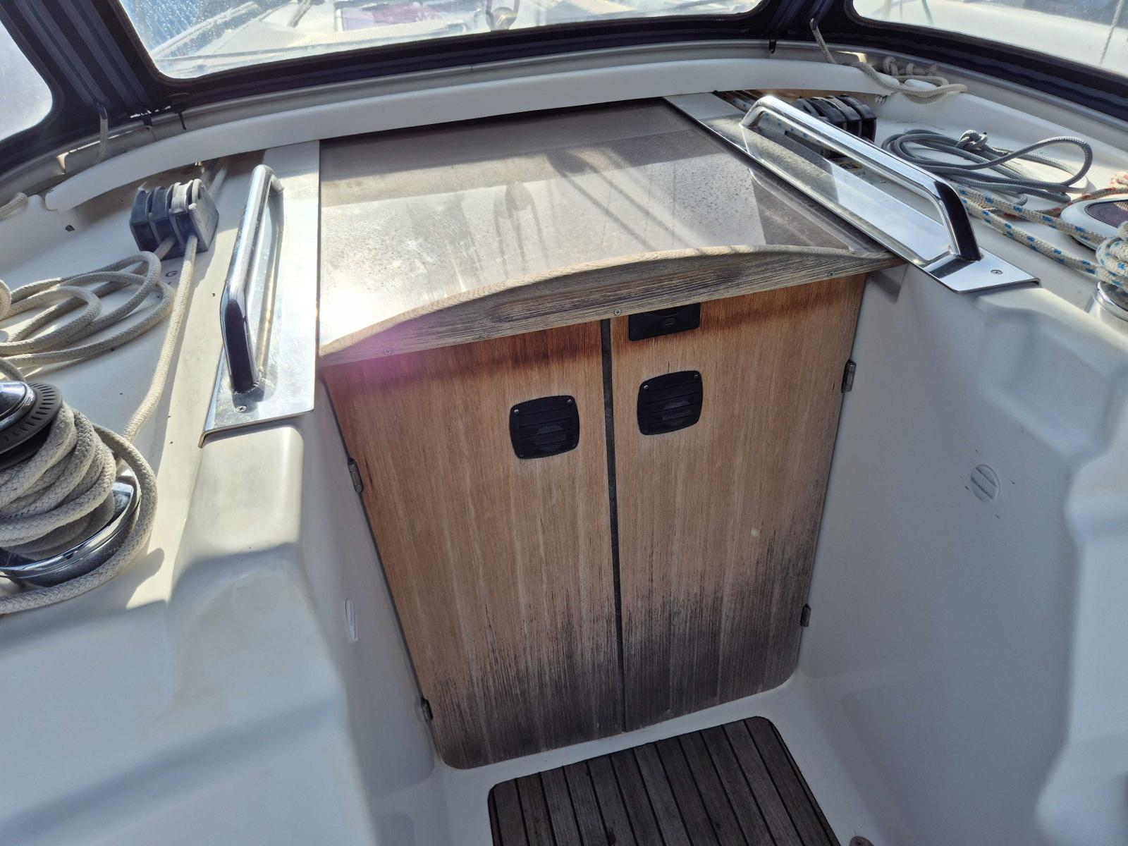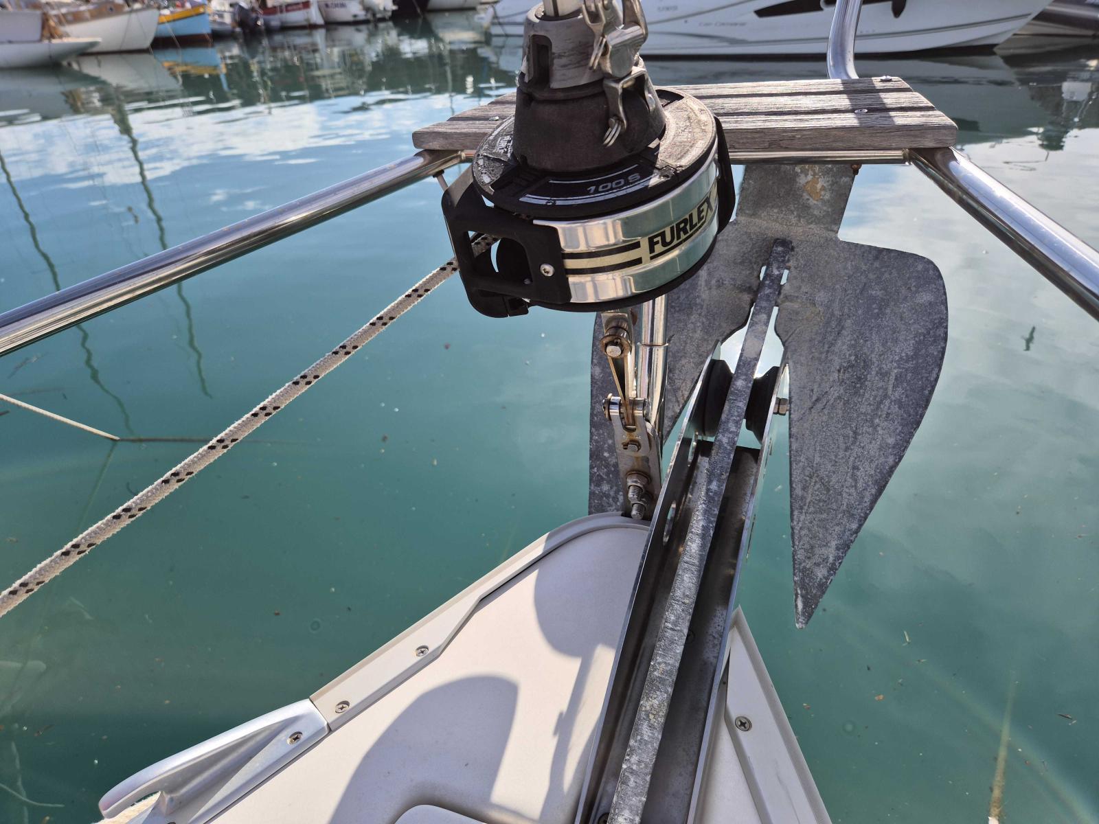 Il est équipé d’un moteur Volvo Penta D1-26 totalisant seulement 881 heures, avec révision complète prévue pour la livraison 2026. La grand-voile et le génois datent de 2025, la capote et le bimini sont de 2024, et le radeau de survie reste valide jusqu’en 2027.