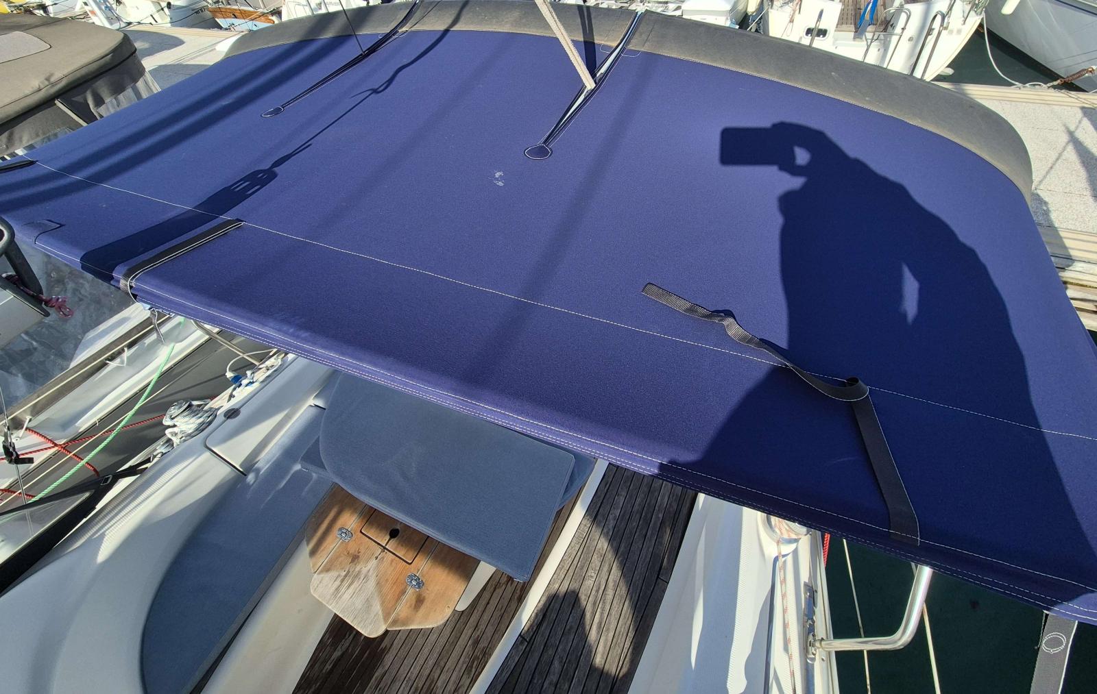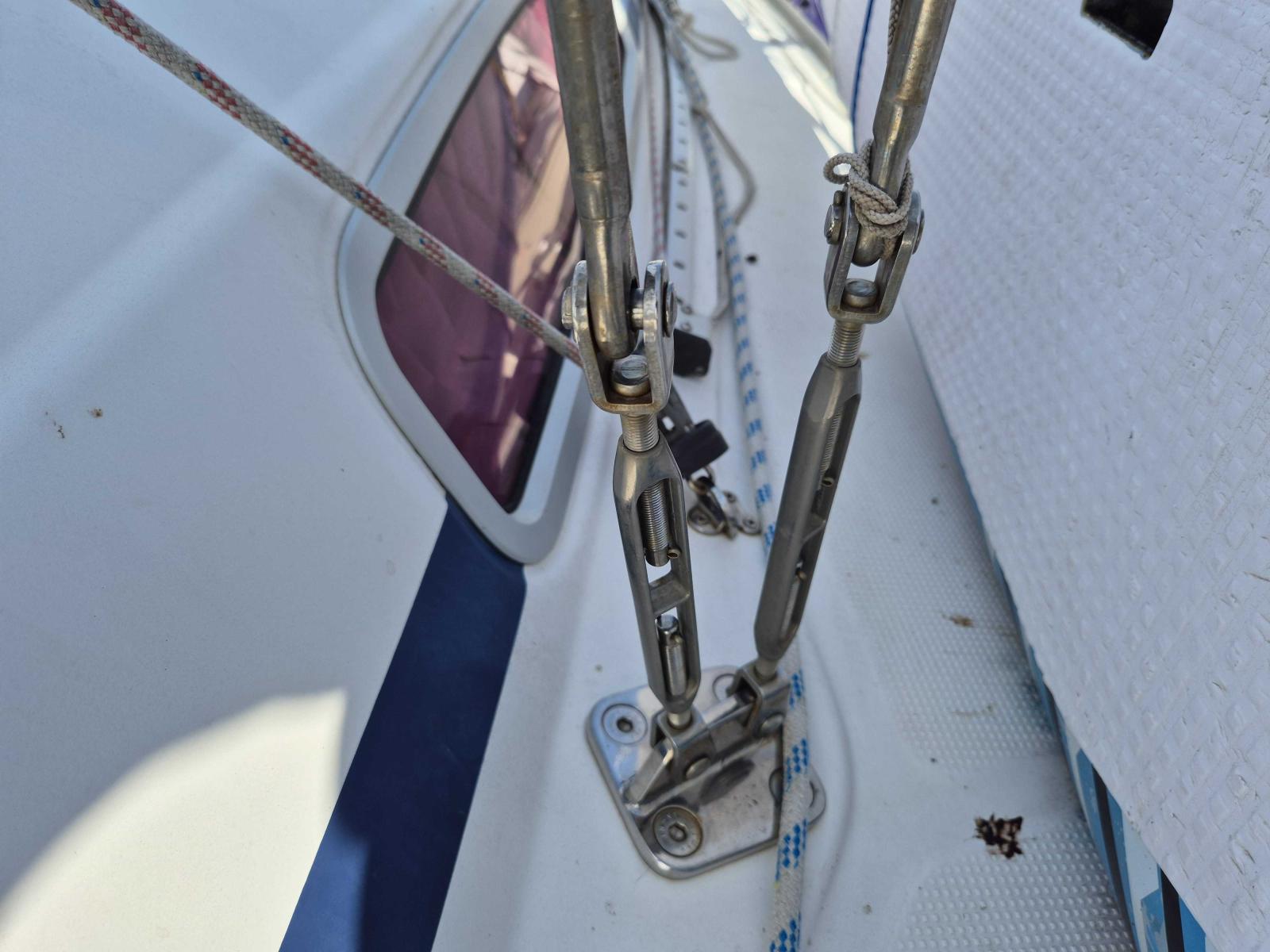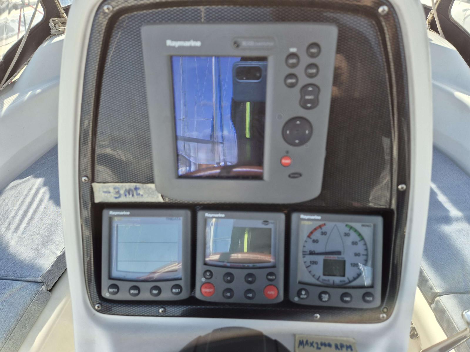 Il est équipé d’un moteur Volvo Penta D1-26 totalisant seulement 881 heures, avec révision complète prévue pour la livraison 2026. La grand-voile et le génois datent de 2025, la capote et le bimini sont de 2024, et le radeau de survie reste valide jusqu’en 2027.