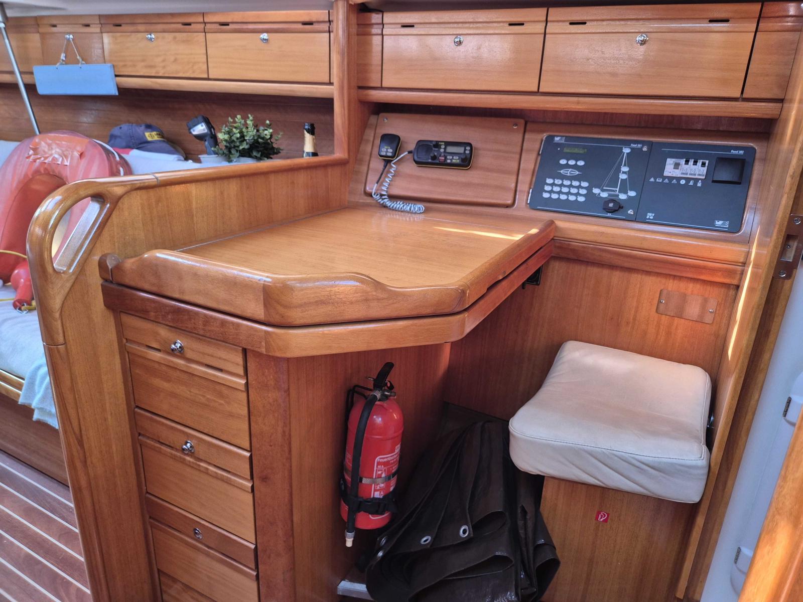 La cuisine en L est parfaitement aménagée avec un réchaud deux feux, un four, un réfrigérateur top-loading et de nombreux rangements. La salle d’eau, spacieuse et fonctionnelle, est équipée d’un WC marin. La hauteur sous barrot d’environ 1,82 mètre assure un excellent confort à bord, même lors de longues croisières.