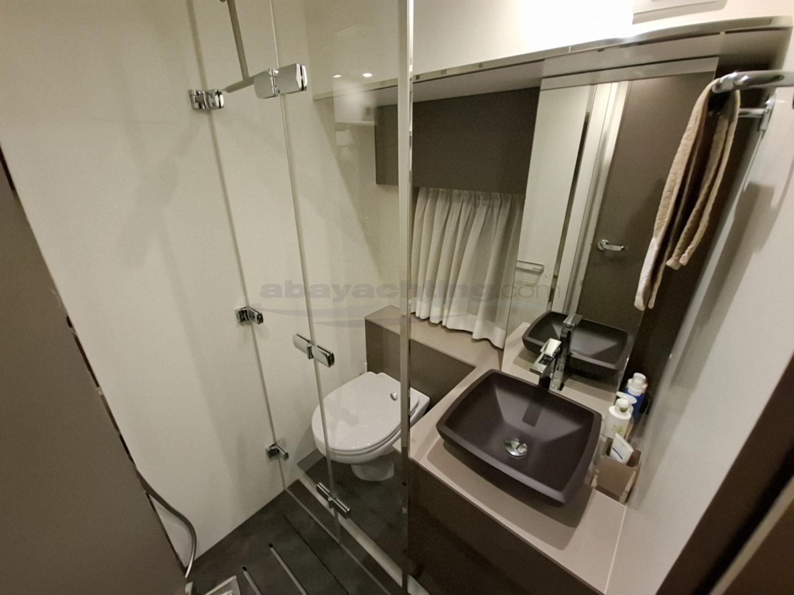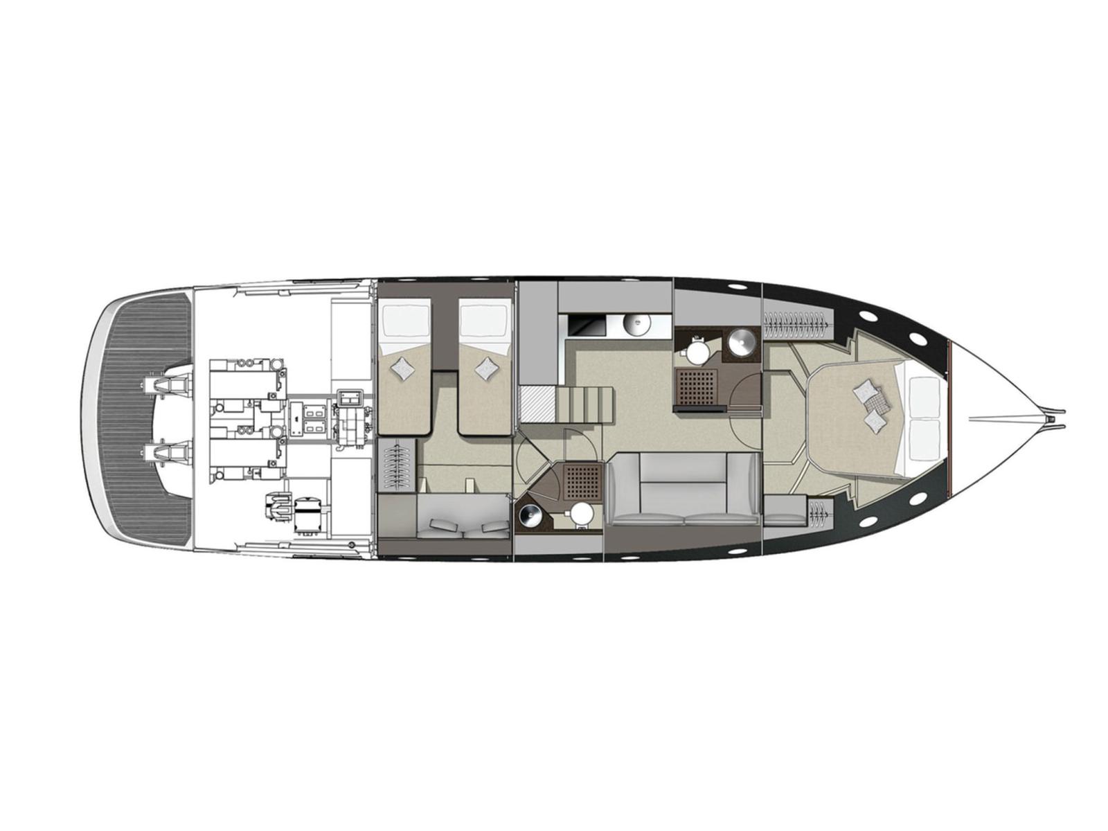 Aménagement intérieur : 7 couchettes, chambre double avec salle de bain attenante, lits jumeaux convertibles en lit double avec troisième lit supplémentaire, coin repas convertible.