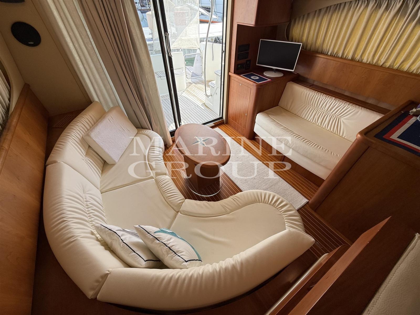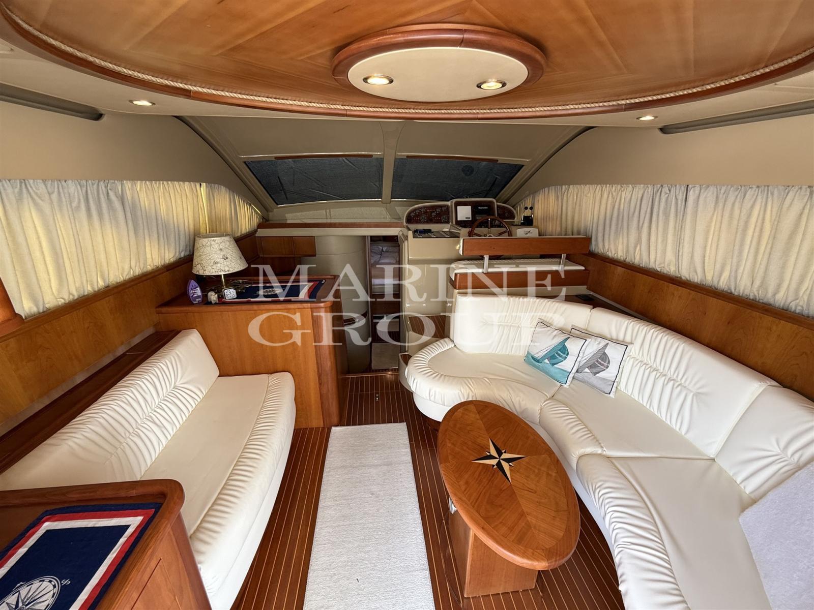 Intérieurs en bois de cerisier ; Canapés en cuir blanc contrastés ; poste de barre ; Cuisine entièrement équipée ; Cabine propriétaire à l’avant avec lit double et salle de bain attenante ; Cabine d’invités avec lits simples plats ; Deuxième salle de bain complète avec deux accès.