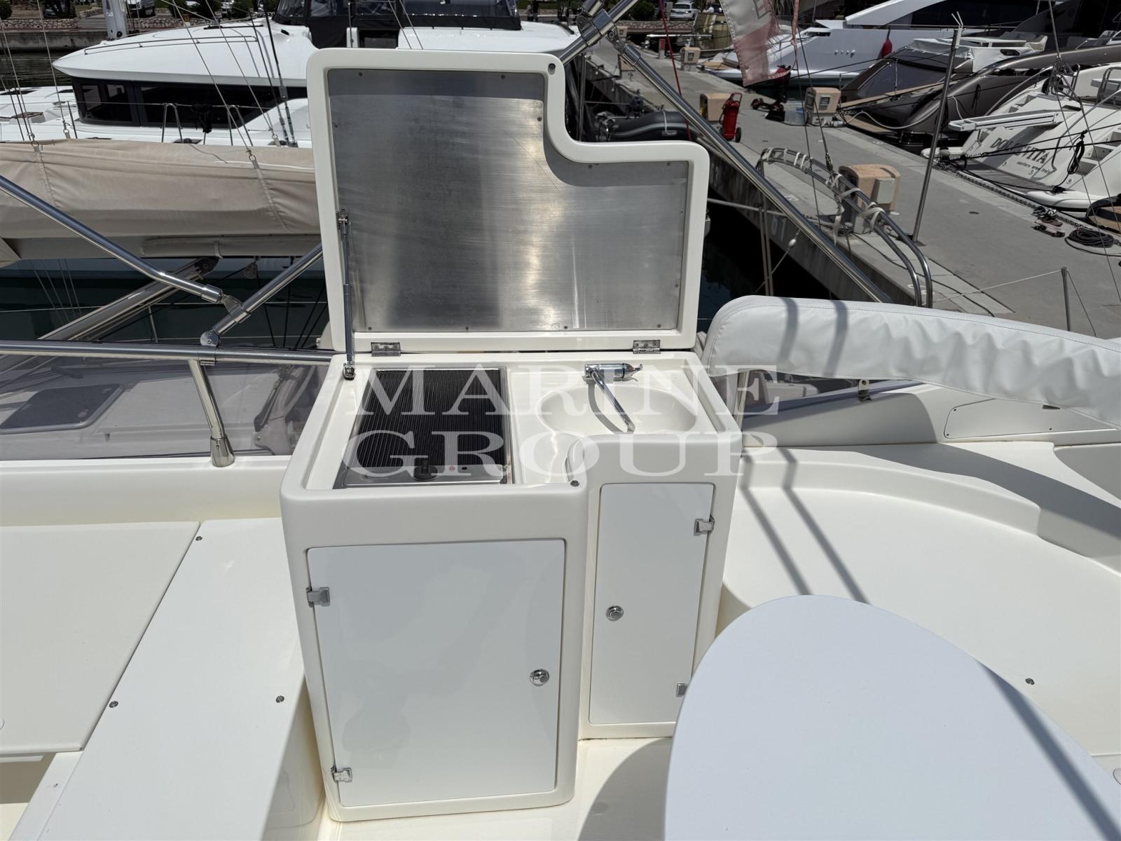 Douche de cockpit, Double barre à roue, Flaps hydrauliques, Éclairage de courtoisie, Passerelle, Plateforme arrière, Porte latérale, Cockpit en teck, Prise de quai, Connexion eau sous pression à quai, Guindeau électrique, Echelle de bain, Table pliante de salon, Corne.