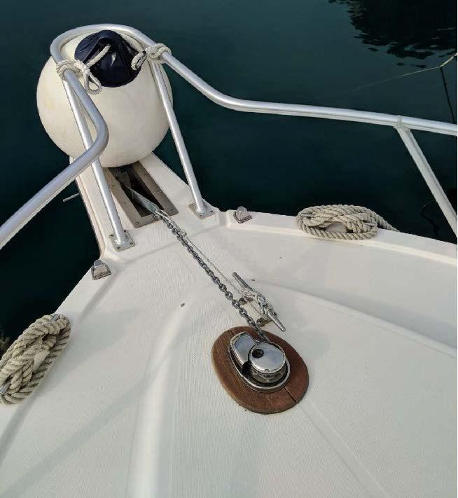 Cabine en V à l’avant, kitchenette avec réfrigérateur, évier et four à micro-ondes, salle à manger convertible en lit double et salle de bain séparée avec toilettes électriques et douche.