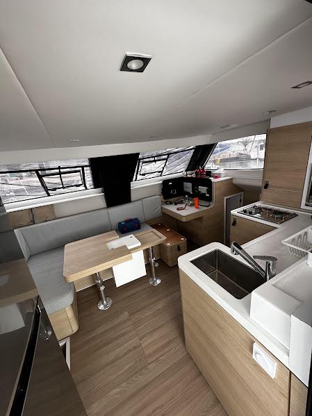 Les espaces sont lumineux et bien agencés pour une movilité aisée, vous permettant de rester en contact avec vos passagers tout en cuisinant ou en pilotant. Différents espaces indépendants sont également disponibles : un bain de soleil à l'avant, un flybridge et une table extérieure.
