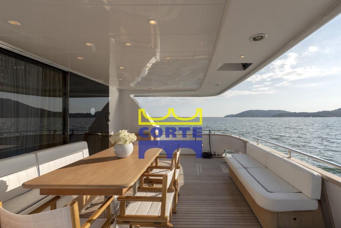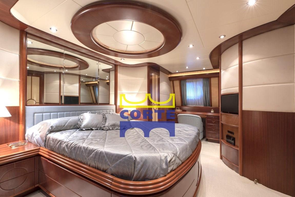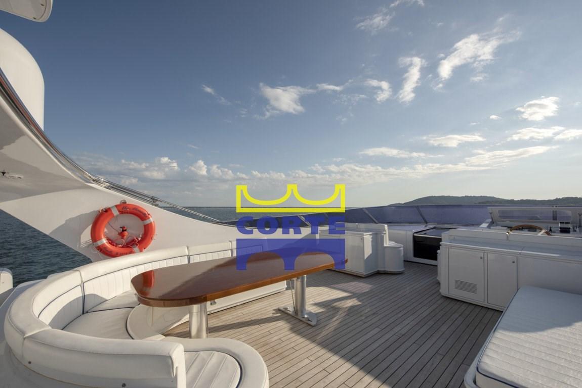 Alarme moteur, Alarme de pompe de cale, Ancre (con catena 150 metri), Eau sous pression, Système de vidange, Passavant en teck, Douche de cockpit, Double barre à roue, Phare de poursuite, Flaps hydrauliques, Grue de flybridge, Extincteur(s) fixe(s), Éclairage de courtoisie, Spots sous-marins, Jet-ski, Passerelle, Pompe de cale automatique, Porte latérale, 2 Porte latérale, Cockpit en teck, Prise de quai, Connexion eau sous pression à quai, Rollbar, Guindeau électrique, Echelle de bain, table de cockpit, Annexe, Corne, Winch électrique arrière, Winch électrique avant.