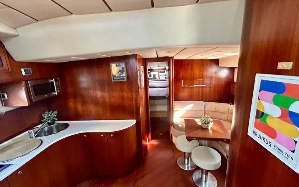À l’intérieur, le carré offre une atmosphère chaleureuse grâce à ses boiseries, avec un agencement confortable comprenant trois cabines ainsi qu’une cabine équipage. Les volumes sont bien répartis, permettant d’accueillir famille et invités dans un cadre agréable. La cuisine intérieure est complète et fonctionnelle, parfaitement intégrée à l’espace de vie.