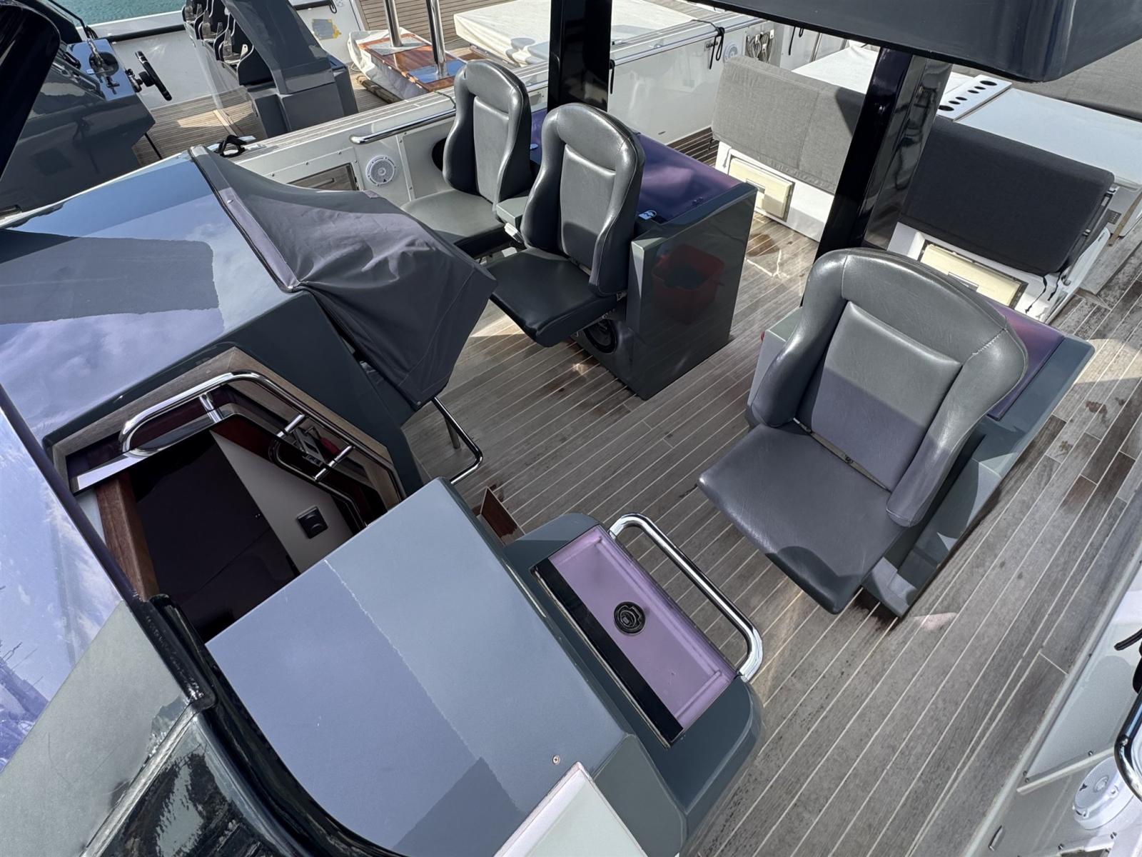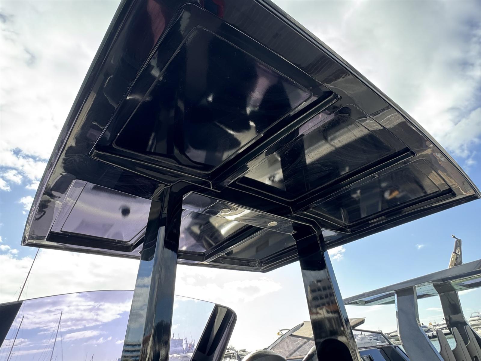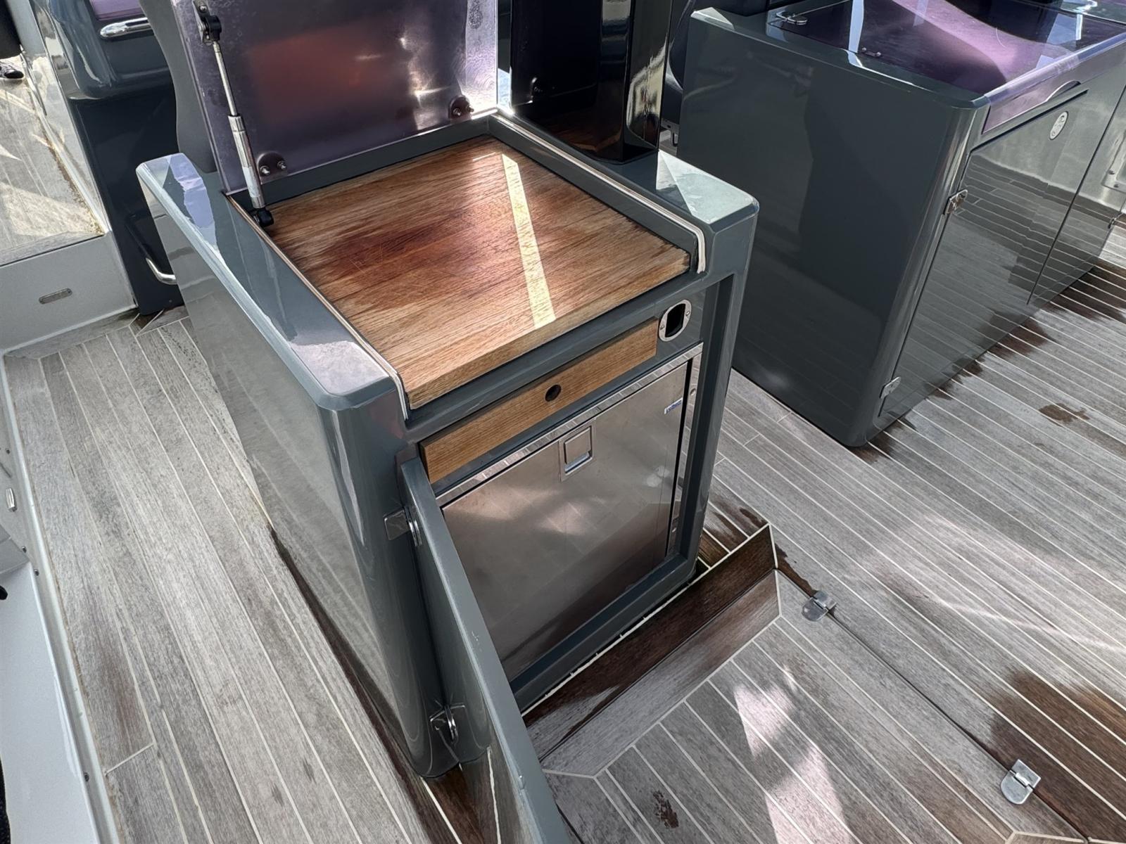 Alarme moteur, Alarme de pompe de cale, Ancre (10kg + 50m SS chain with hydraulic arm system), Eau sous pression, 6 Batteries, 6 Taquets pliants, Système de vidange, Passavant en teck, Couleur spéciale (DARK GREY T 7156), Douche de cockpit, Flaps électriques, Extincteur(s) fixe(s) (firebuoy), Indicateurs de flaps, Lavabo dans le cockpit, Éclairage de courtoisie (Blue), 4 Spots sous-marins (Blue), Plateforme arrière (extended and fixed), 2 Pompe de cale automatique, Porte latérale (sliding), Cockpit en teck, Prise de quai, Guindeau électrique, Echelle de bain, table de cockpit (on electric pedestal convetible into sunpad), 2 Filières avec sortie latèrale, Corne, T-Top (painted Jet black).