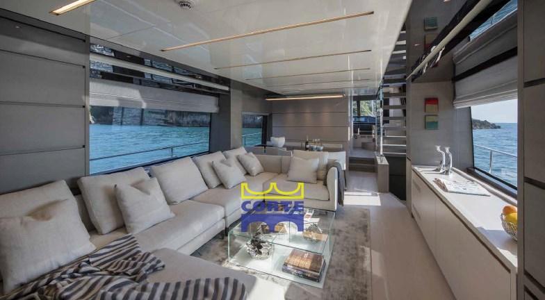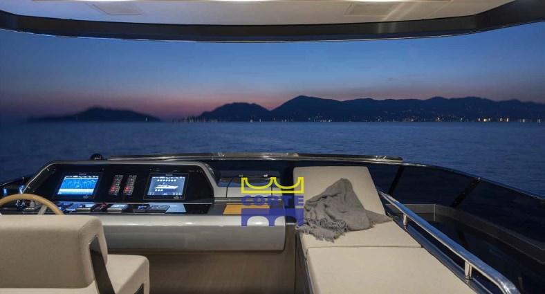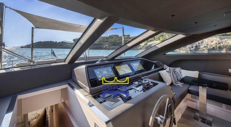 Alarme gaz, Alarme moteur, Alarme de pompe de cale, Ligne d'arbre de rechange, Eau sous pression, Système de vidange, Passavant en teck, 2 Chargeur de batterie, Douche de cockpit (con colonna doccia inox), Double barre à roue, Propulseur de poupe (elettrica maggiorata a 20 Kw), Hélice de rechange, Phare de poursuite, Flaps électriques, Garage à annexe, Hard top (con tetto apribile elettrico a lamelle), Extincteur(s) fixe(s), Éclairage de courtoisie, Spots sous-marins, Passerelle (elettroidraulica a scomparsa), Plateforme arrière (di poppa), Pompe de cale automatique, Porte latérale, Porte latérale, Cockpit en teck, Prise de quai, Connexion eau sous pression à quai, Guindeau électrique, Echelle de coupée (rimovibile con aggangi su entrambi i lati), Echelle de bain, Stabilisateurs (pinne stabilizzatrici elettriche Zero Speed (all'ancora e in navigazione)), table de cockpit, Corne, 2 Winch électrique arrière, Winch électrique avant.