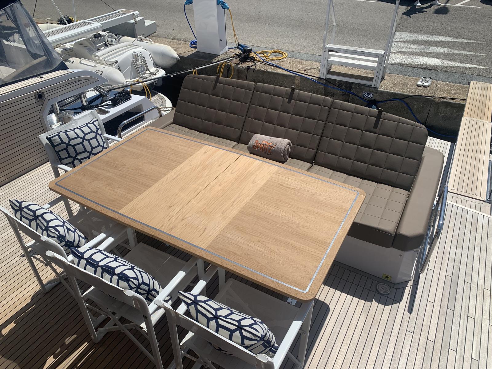 Table électrique en teck dans le cockpit