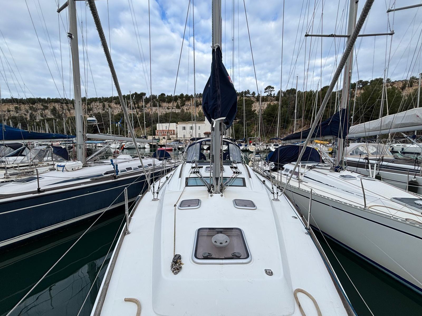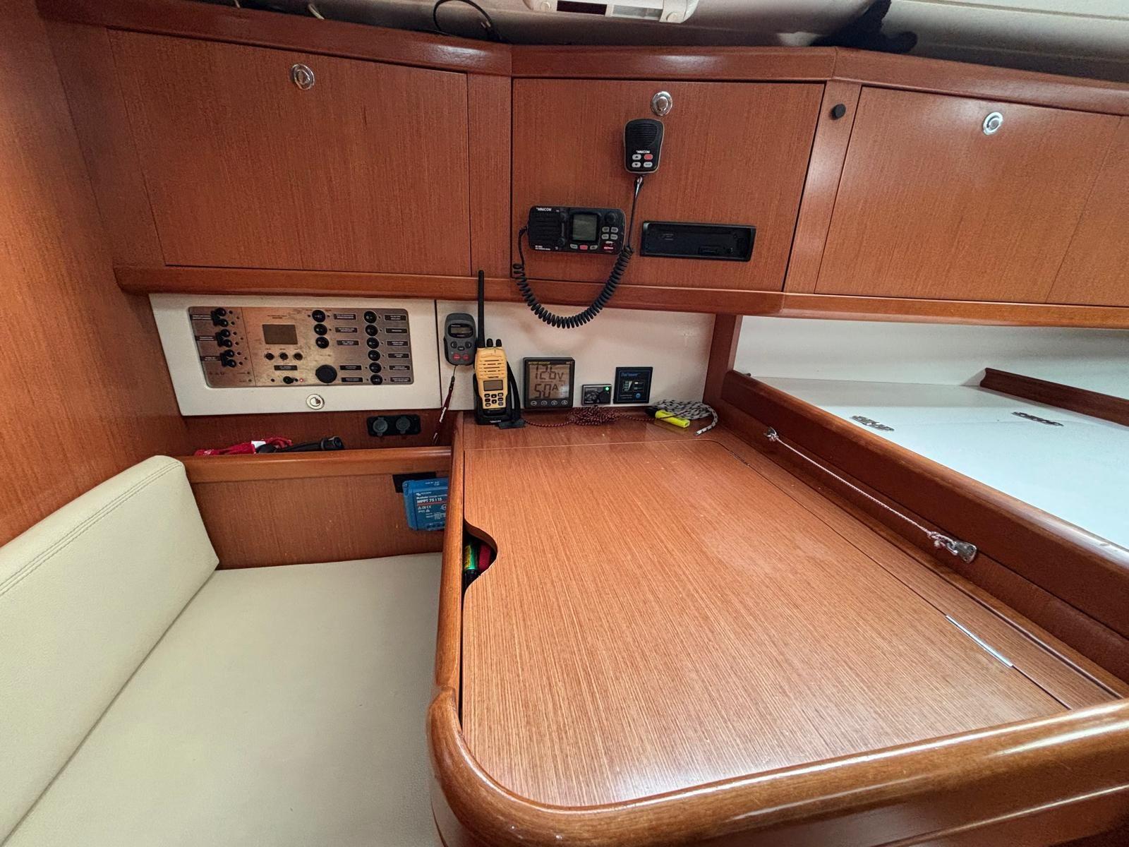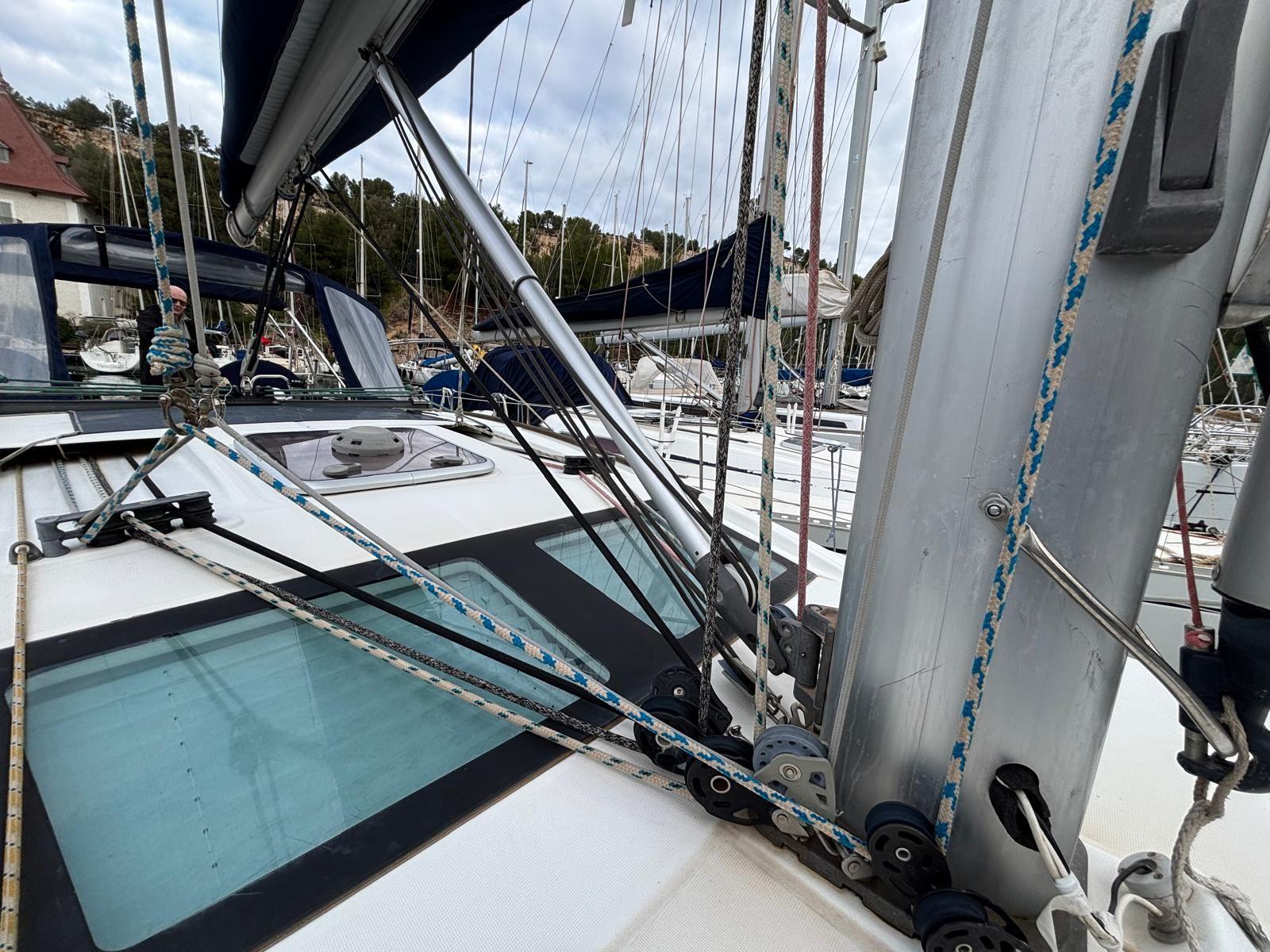 L’équipement électronique est complet, incluant notamment un pilote automatique avec télécommande, idéal pour les navigations en équipage réduit. Pour les amateurs de voile, le bateau dispose d’un gréement de spi sur rail, d’un spi asymétrique, d’un spi symétrique, de deux grandes voiles, ainsi que d’un génois triradial neuf de 2024, performant et robuste.