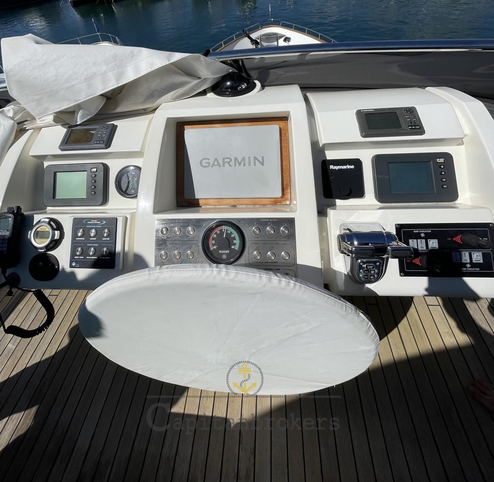 Alarme moteur, Alarme de pompe de cale, Eau sous pression, Passavant en teck, Douche de cockpit, Flaps hydrauliques, Bossoirs pour annexe, Lavage de chaine, Lavabo dans le cockpit, Passerelle (Elettroidraulica), Plateforme arrière (in teak, tender lift), Pompe de cale manuelle, Porte latérale, Porte latérale, Cockpit en teck, Prise de quai, Connexion eau sous pression à quai, Guindeau électrique, Echelle de bain, table de cockpit, Winch électrique avant.