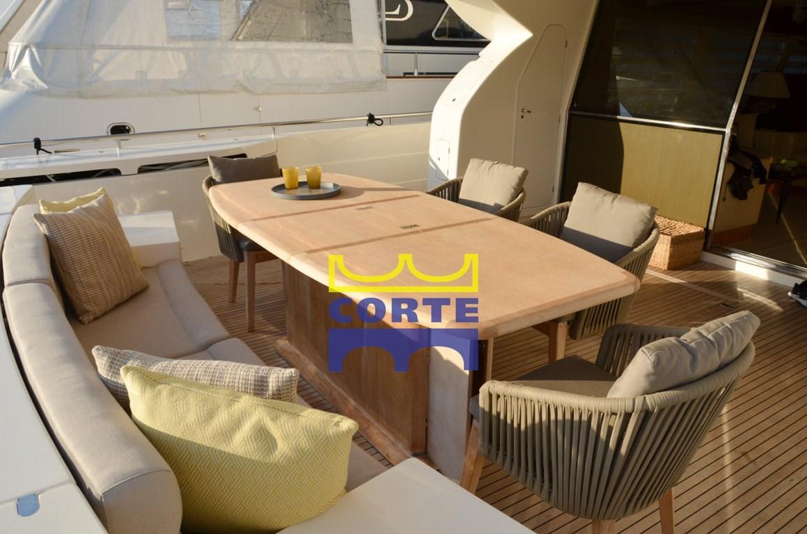 Alarme gaz, Alarme moteur, Alarme de pompe de cale, Ancre (tipo Bruce 50 Kg diff. da 30 Kg), Eau sous pression, 8 Batteries, Passavant en teck, Douche de cockpit, Double barre à roue, Flaps hydrauliques, Grue de flybridge, Extincteur(s) fixe(s), Éclairage de courtoisie, 2 Spots sous-marins (LED), Panneau solaire, Passerelle (elettroidraulica in legno teak), Plateforme arrière (in teak), Pompe de cale automatique, Porte latérale, Porte latérale, Cockpit en teck, Prise de quai, Connexion eau sous pression à quai, Répétiteur électronique, Rollbar, Guindeau électrique, Echelle de bain, Stabilisateurs (Anti RollingGyro), table de cockpit, Annexe, Corne, 2 Winch électrique arrière, 2 Winch électrique avant.