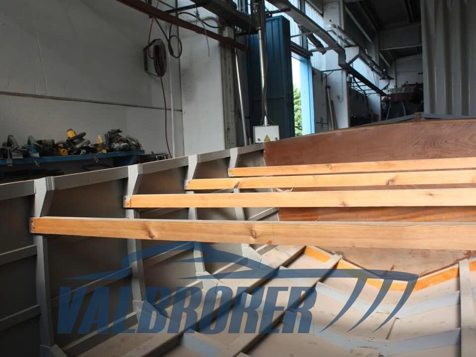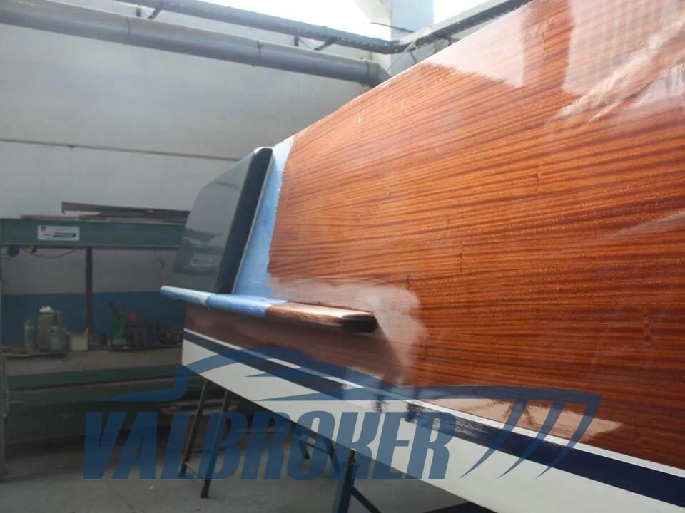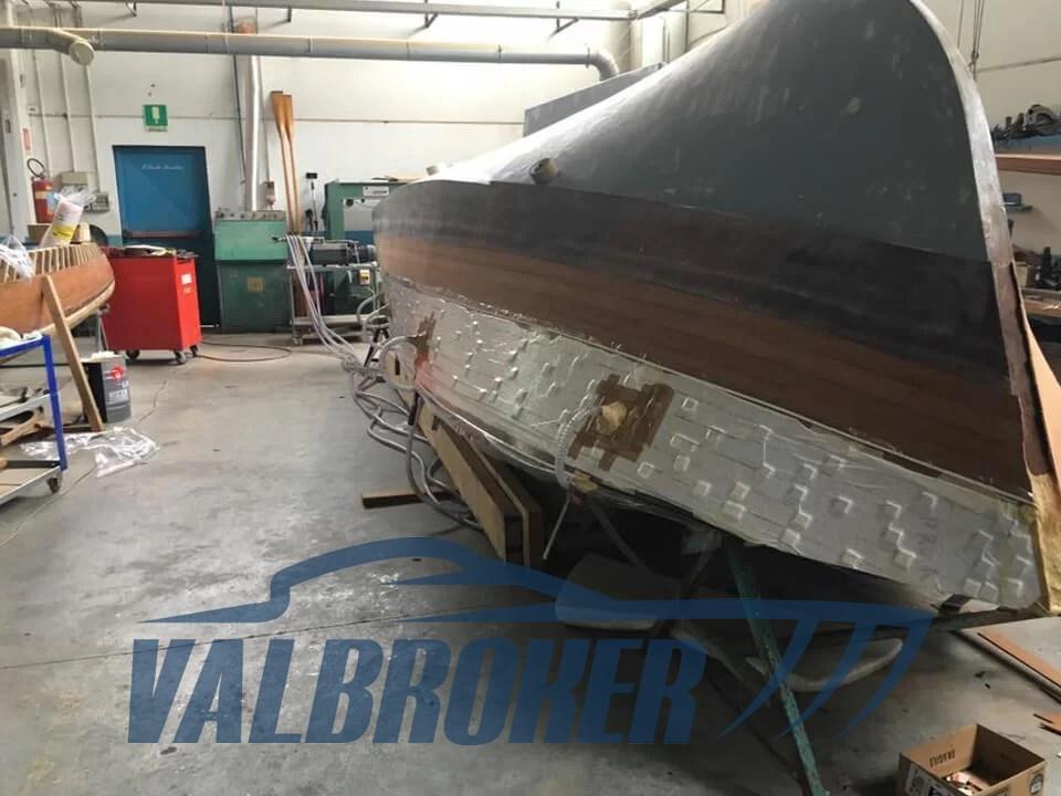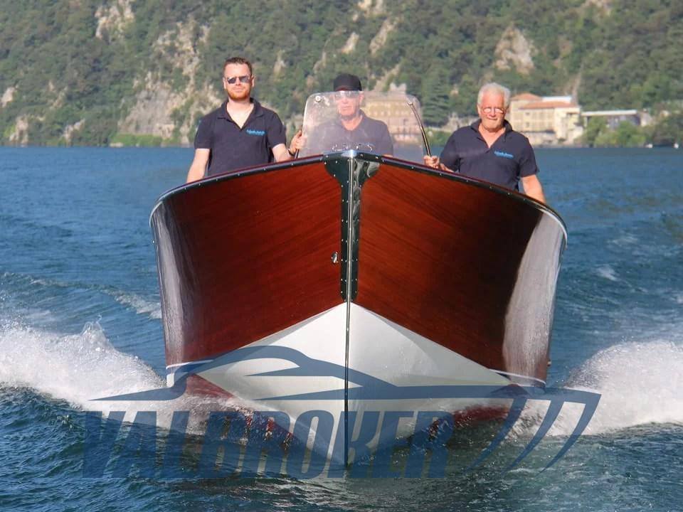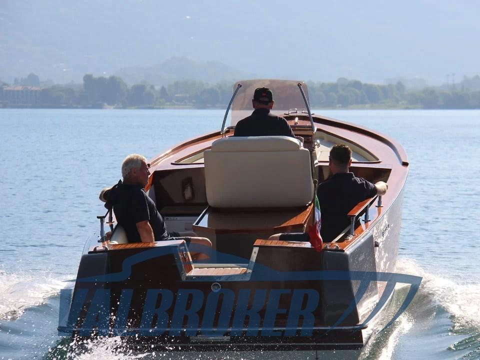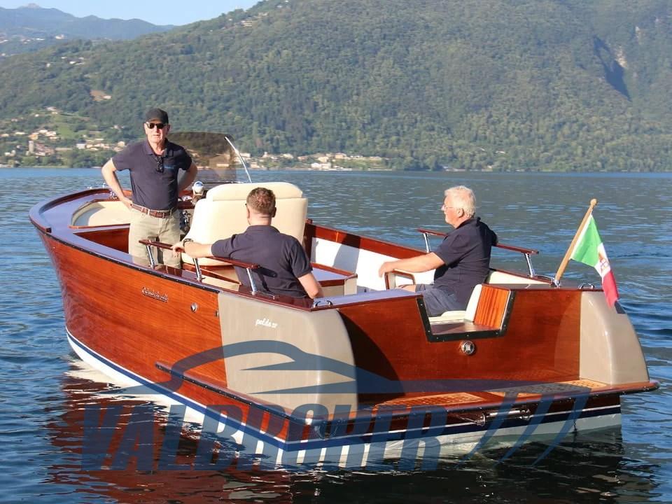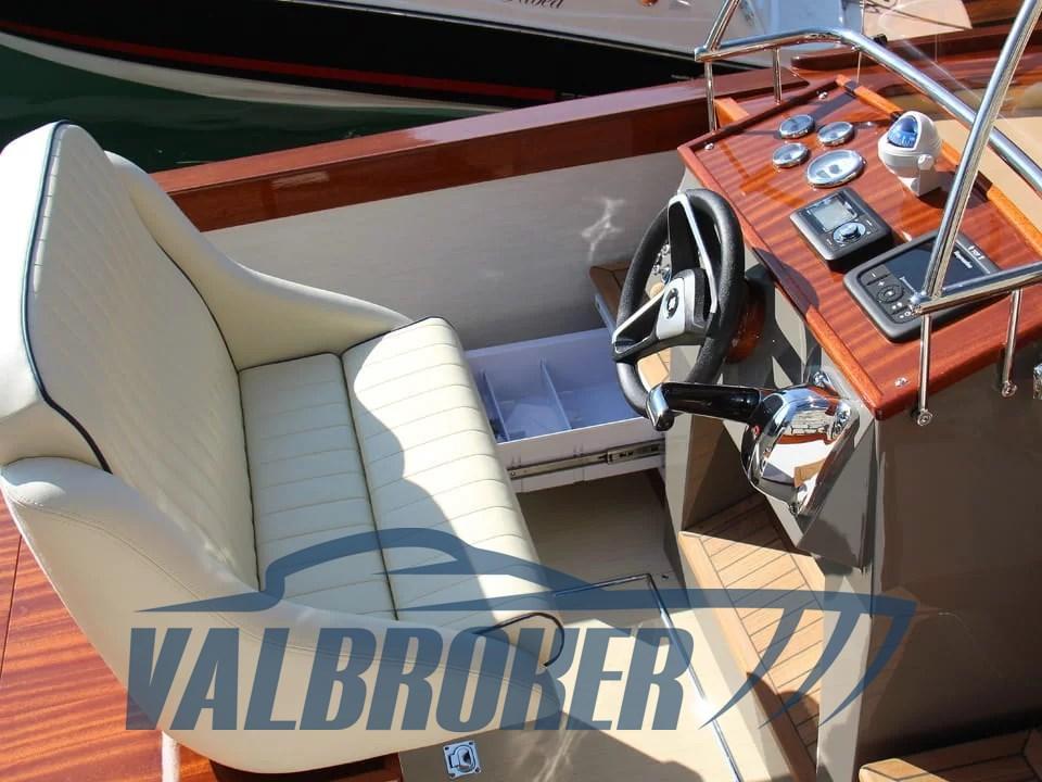 BATEAU NEUF. Poldo 23, le bateau du 70e anniversaire, construit en acajou, chêne et iroko. Équipé d’un moteur diesel in-bord et d’une transmission par axe. Le grand bain de soleil à l’avant, le poste de pilotage avec strapontin pour la conduite debout, le compartiment moteur central, les sièges arrière avec le canapé en forme de « U » et enfin la plate-forme de bain avec grille en teck. Les coussins du bain de soleil avant cachent un grand coffre pour le rangement des gilets de sauvetage et du matériel, qui peut devenir une couchette d’urgence si nécessaire. On y accède par deux marches sur les côtés du tableau de bord. La console est équipée d’instruments de navigation classiques, notamment le tachymètre, le niveau de carburant, la pression d’huile, le compteur d’entretien numérique. Deux batteries de 80 Ah fournissent chacune de l’énergie pour le moteur et les services.