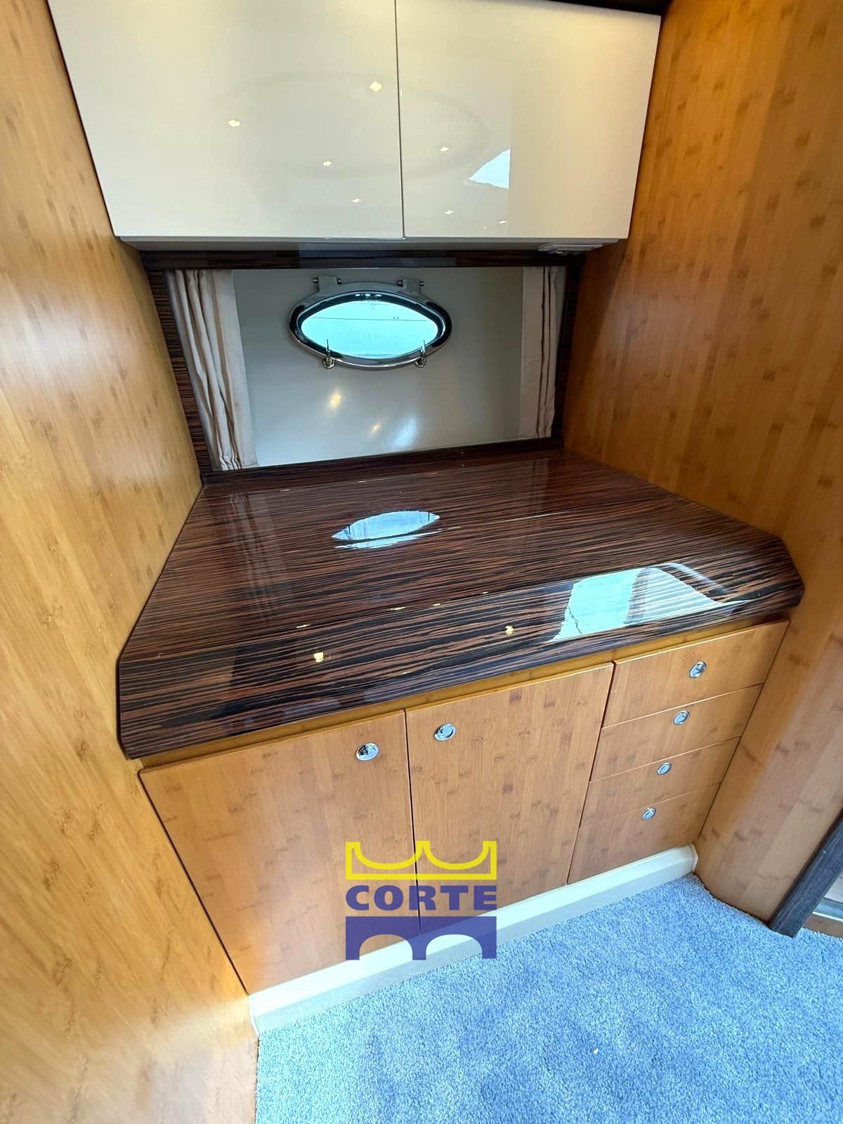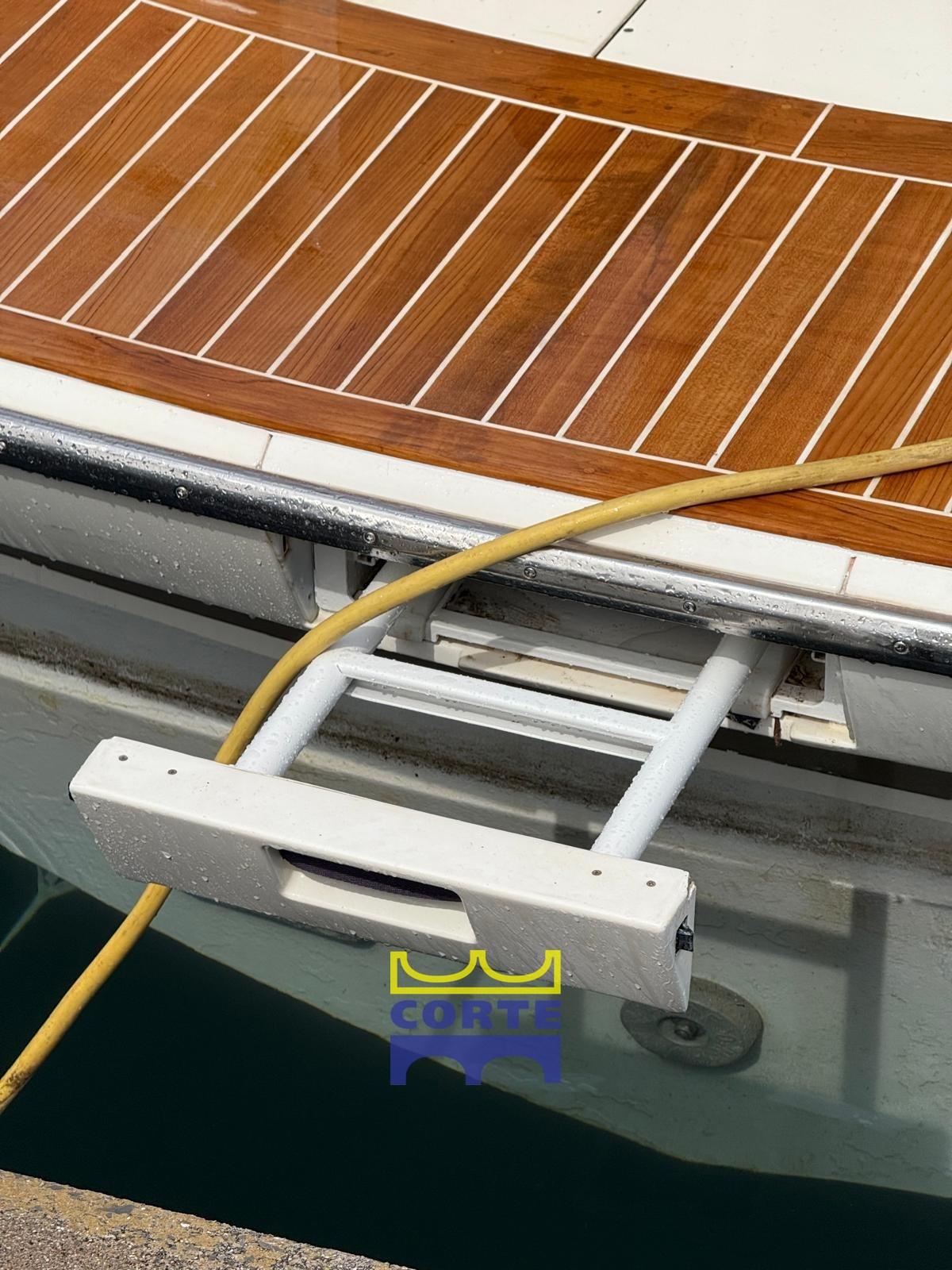 Alarme moteur, Alarme de pompe de cale, Eau sous pression, Câble d’alimentation à quai, Douche de cockpit (pozzetto con acqua calda), Garage à annexe, Extincteur(s) fixe(s), Lavabo dans le cockpit, Passerelle (idraulica), Plateforme arrière (in teak), Porte latérale, Cockpit en teck, Prise de quai, Guindeau électrique, Echelle de bain, table de cockpit.