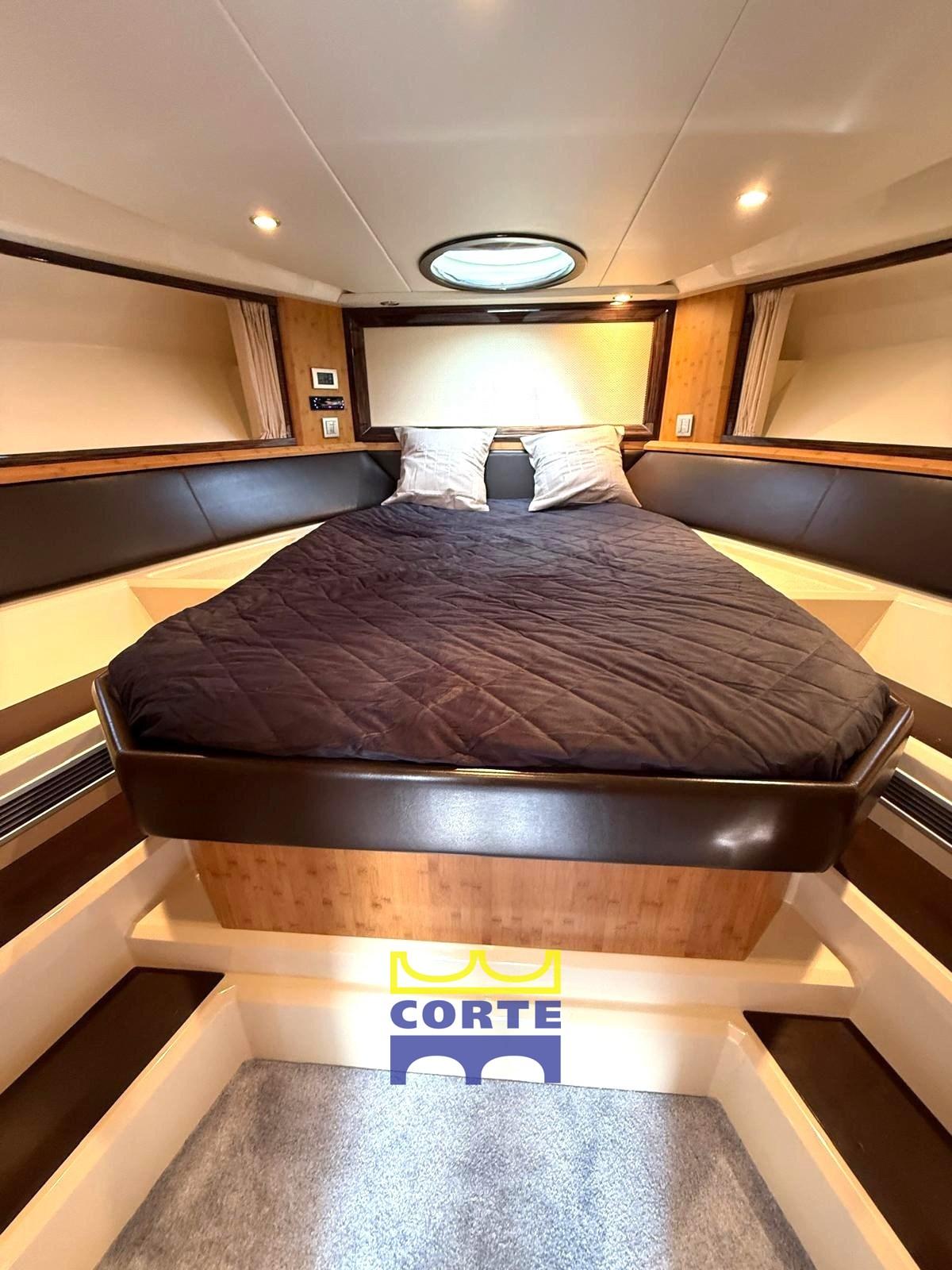 Cabine d’invités à deux lits avec salle de bain arrière dédiée sous le cockpit.