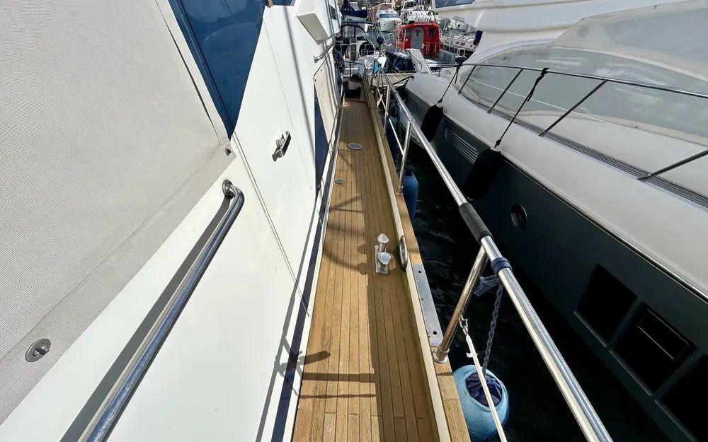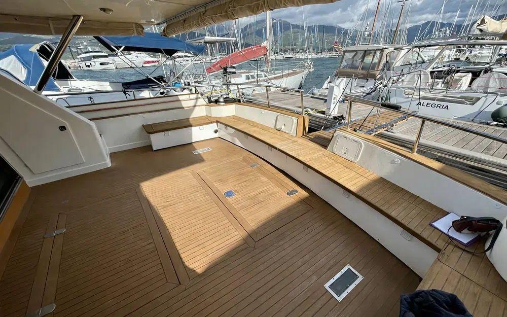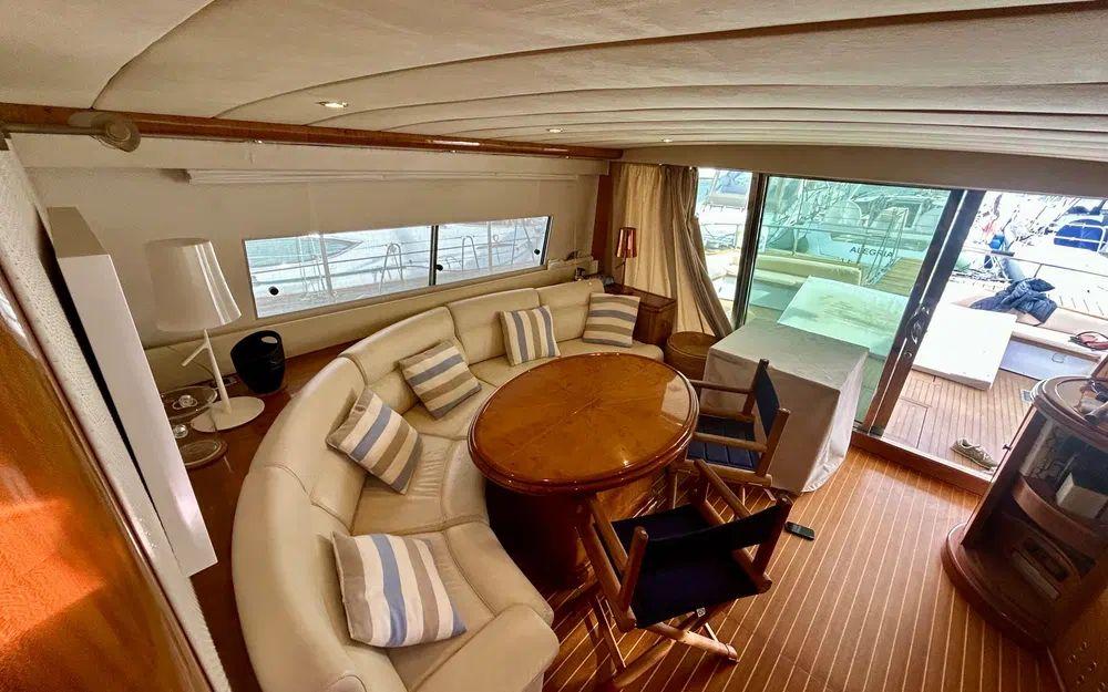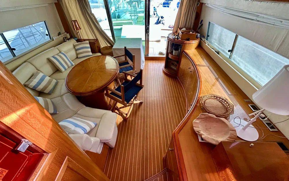 Dès l’embarquement, le niveau de finition frappe immédiatement. Les inox sont en excellent état, le teck a été récemment traité, l’arceau lumineux a été repeint et chaque élément extérieur bénéficie de protections dédiées. La passerelle hydraulique avec rampe facilite les accès, tandis que la sellerie cockpit, les coussins et les housses de protection témoignent d’un soin permanent. La table extérieure accompagnée de ses chaises en bois et beige renforce l’élégance des espaces de réception. Le flybridge, accessible par l’intérieur, offre un véritable espace de détente avec table, rangements et bimini.
