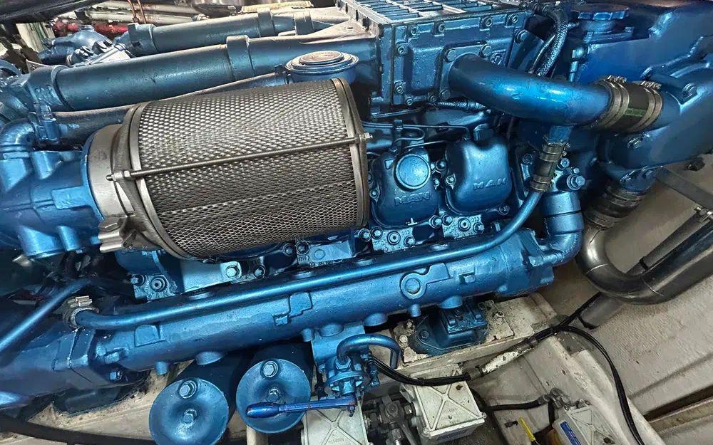 Sur le plan technique, la motorisation MAN associée à une transmission par lignes d’arbres assure fiabilité et rendement. Les échangeurs ont été nettoyés et contrôlés, les arbres d’hélices sont neufs, et l’ensemble bénéficie d’un suivi sérieux. Deux groupes électrogènes, une gestion d’énergie intégrée, un convertisseur, deux chargeurs de batteries, une climatisation à double compresseur, l'électronique Raymarine HybridTouch AXIOM avec caméra moteur, le pilote automatique, le propulseurs d’étrave et de poupe viennent compléter un équipement particulièrement complet.