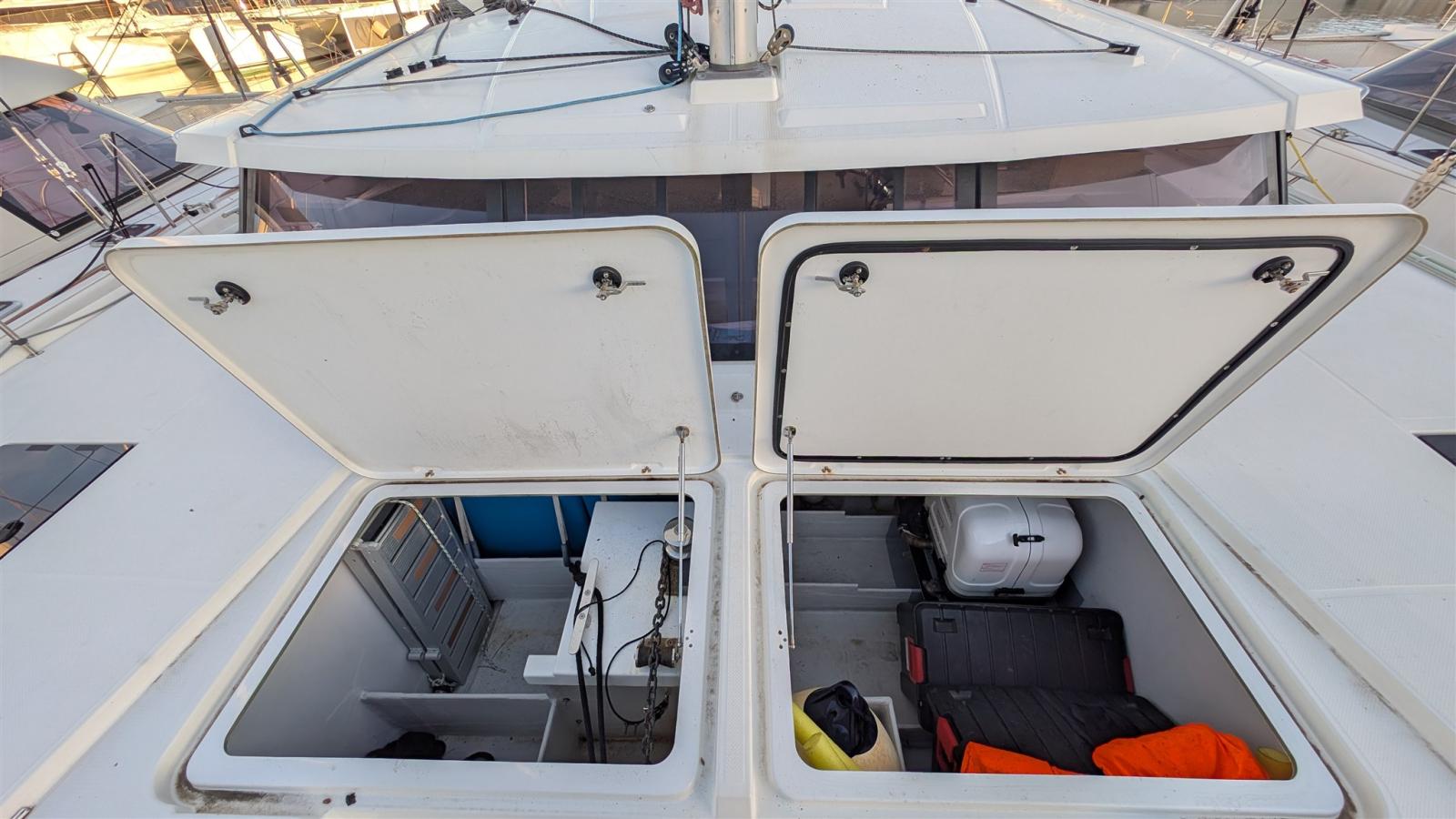 Alarme moteur, Alarme de pompe de cale, Alternateur, 4 Winch selftailing, Eau sous pression, Radeau de sauvetage (10 PAX), 4 Batteries (660), Câble d’alimentation à quai, Douche de cockpit, Bossoirs pour annexe, Extincteur(s) fixe(s), Éclairage de courtoisie, Moteur hors-bord pour annexe (20 HP Suzuki), 8 Défenses, Passerelle, Pompe de cale automatique, Pompe de cale manuelle, Pompe à Eau de Mer, Prise de quai, Répétiteur électronique (Garmin), Guindeau électrique, Gréement monotoron, Echelle de bain, table de cockpit, Table pliante de salon (3 fonctions (Haute/Basse/Sommier), Annexe, Winch électrique arrière.