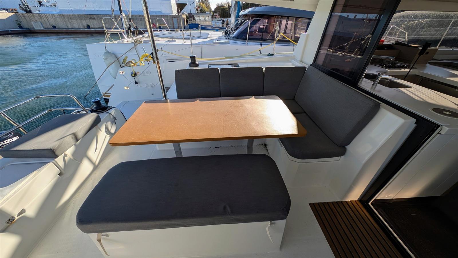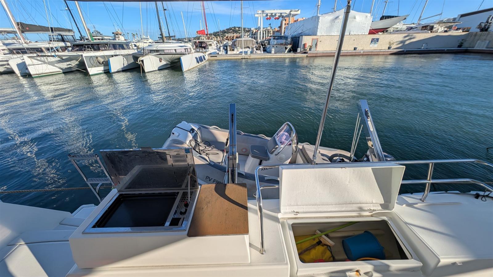 À l’extérieur, le cockpit spacieux et convivial est agrémenté d’une plancha intégrée, parfaite pour les moments de partage au mouillage. L’annexe de 3,30 m équipée de sa console et d’un moteur hors-bord de 20 CV assure des déplacements rapides et confortables à terre.