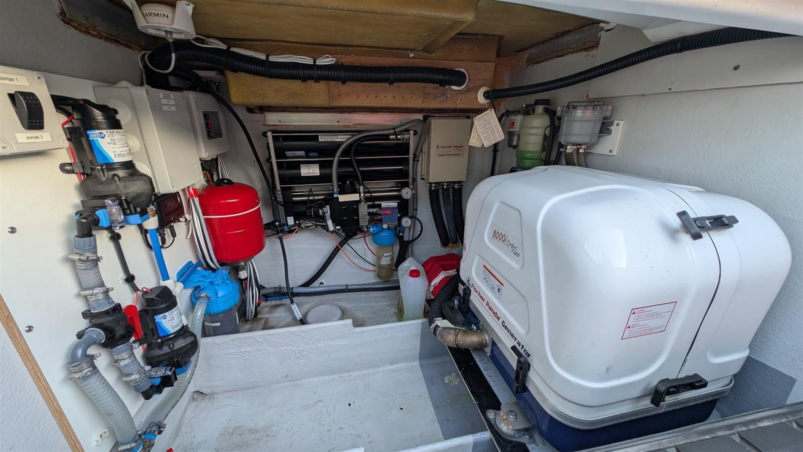 Pensé pour vivre à bord dans les meilleures conditions, il dispose d’un groupe électrogène Panda 8 kW alimentant notamment un véritable espace froid avec réfrigérateur et congélateur séparés, ainsi qu’un dessalinisateur de 105 L/h permettant une totale indépendance au mouillage. Sous voiles, le gennaker complète idéalement le plan de voilure et optimise les performances aux allures portantes, tandis que le radar renforce la sécurité lors des navigations de nuit ou par visibilité réduite.