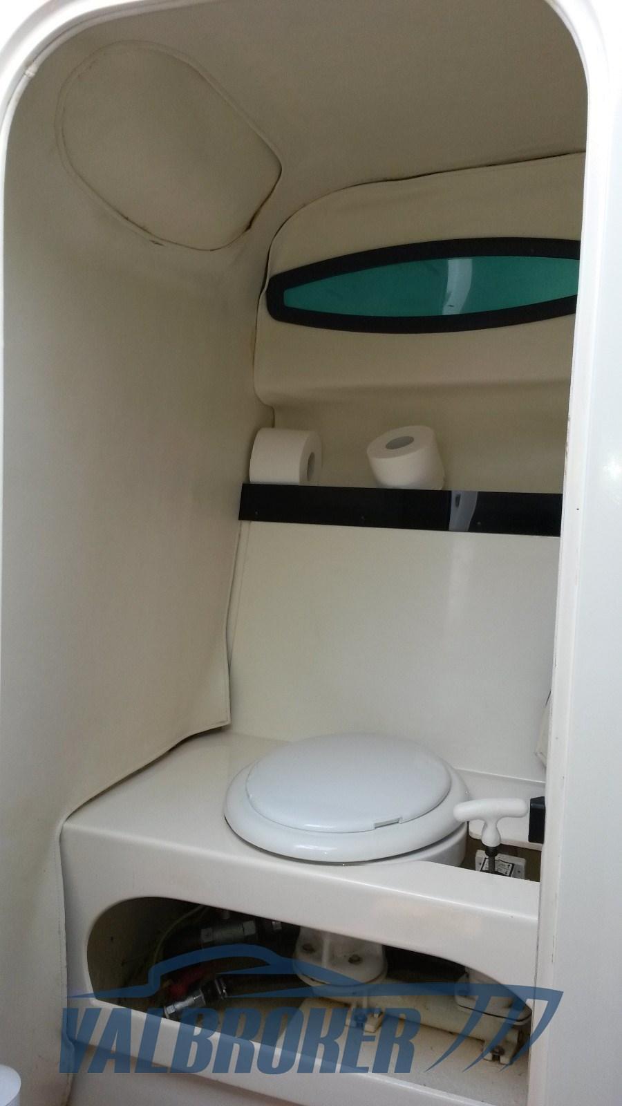 Grand bain de soleil fixe à l’arrière. Salle de bain attenante avec porte.