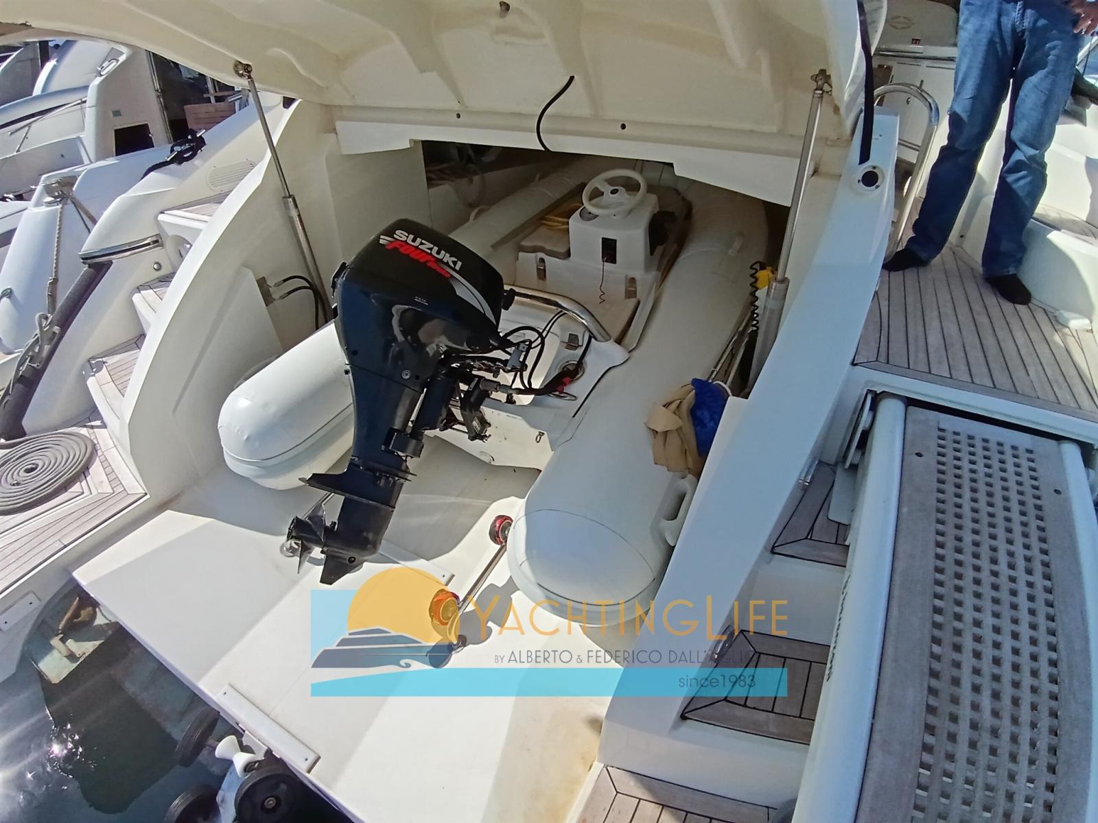Alarme moteur, Alarme de pompe de cale, Ouverture du compartiment moteur électrique, Eau sous pression, 10 Batteries (2025), Douche de cockpit, Flaps hydrauliques, Garage à annexe, Hard top, Extincteur(s) fixe(s), Indicateurs de flaps, Éclairage de courtoisie, Passerelle (idraulica), Plateforme arrière, Pompe de cale automatique, Cockpit en teck, Prise de quai, Guindeau électrique, Echelle de bain, table de cockpit, Corne, Winch électrique arrière.
