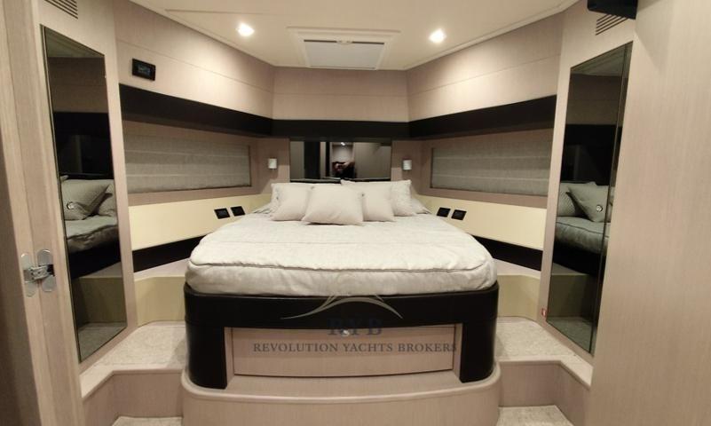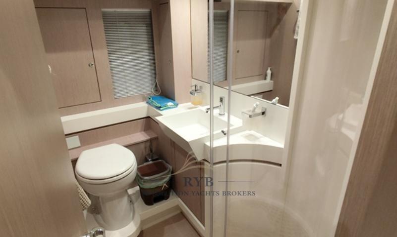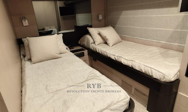 L’espace de vie comprend des canapés confortables, des fauteuils et une table à manger pouvant accueillir jusqu’à huit personnes. Sur le côté gauche, il y a une kitchenette avec une plaque Bosch, un évier avec batteur, un réfrigérateur à colonnes avec congélateur, un lave-vaisselle Bosch, un four Bosch, des tiroirs et des compartiments pour la cuisine et d’autres objets. Le pont inférieur propose quatre cabines bien équipées, dont la cabine principale pleine poutre, une cabine VIP et deux cabines doubles, toutes dotées de salles de bains attenantes. L’environnement est soigné avec moindre moindre, avec des finitions de haute qualité et des matériaux fins.