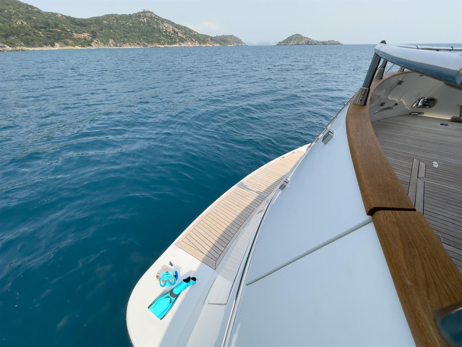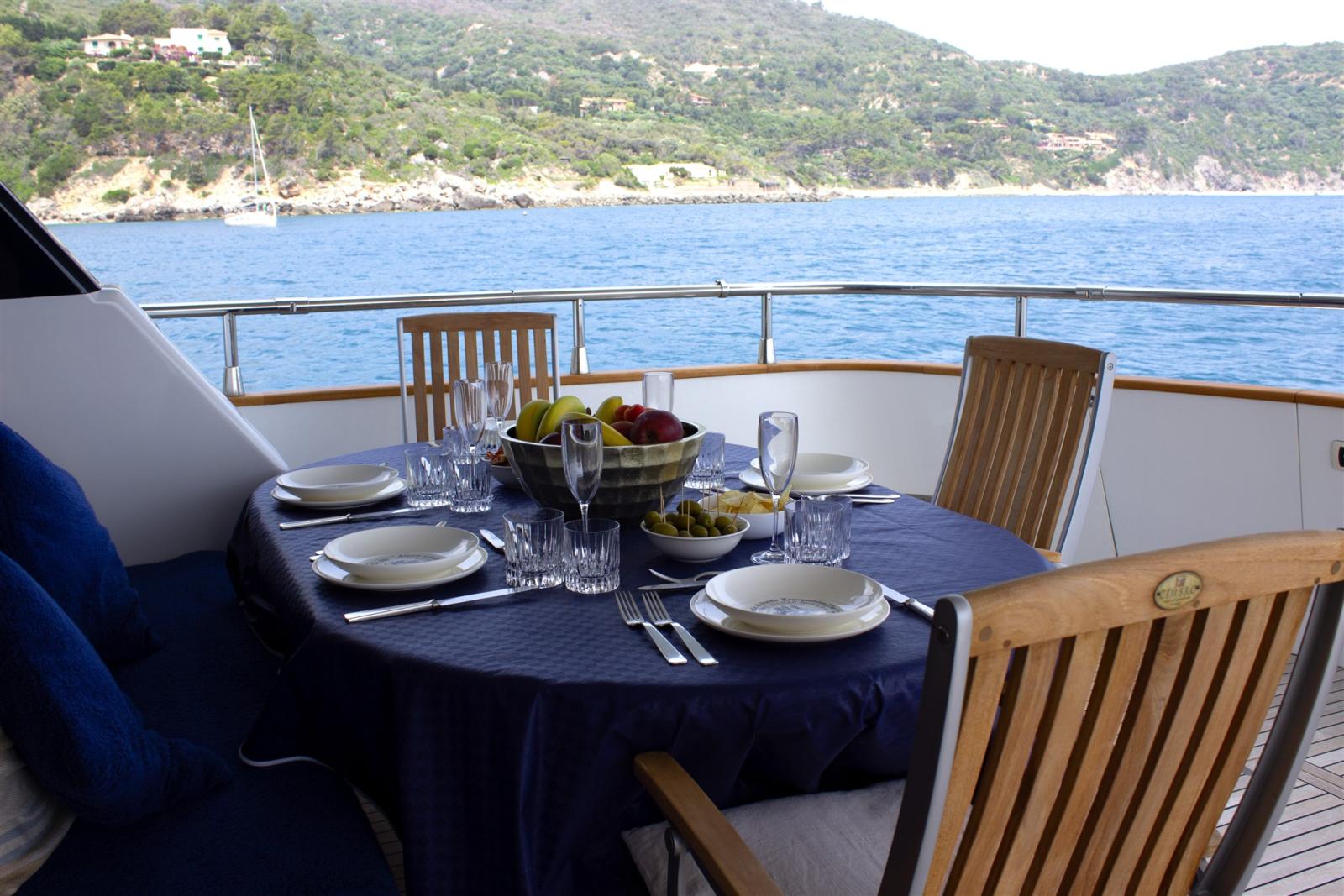 Dehors, nous trouvons une table cockpit avec des sièges pouvant accueillir jusqu’à 8 personnes à la poupe. À la proue, on trouve un large balcon ouvert accessible par de grandes passerelles latérales et une table à la volée pouvant accueillir jusqu’à 4 personnes.