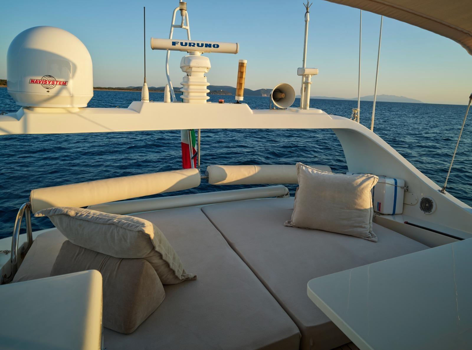 Indicateur d'angle de barre (Barra timone Navicontrol), Compas (A chiesuola “Riviera”), Loch (Raymarine), 3 Sondeur pêche (1 x Furuno – 2 x Raymarine (plancia e fly)), GPS (Compreso nel plotter), 2 Pilote automatique (Navicontrol (plancia e fly)), 2 Lecteur de cartes (Raymarine cartografico touchscreen (plancia e fly)), Radar (Foruno), 2 Radio VHF.