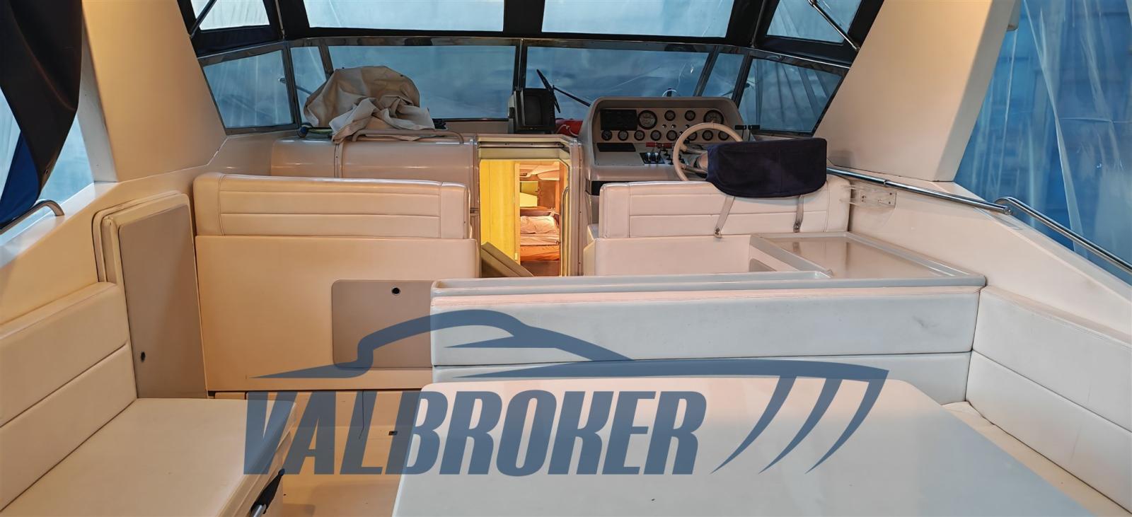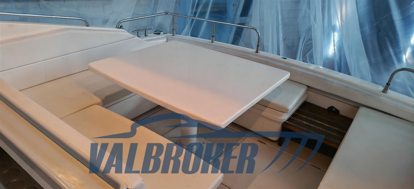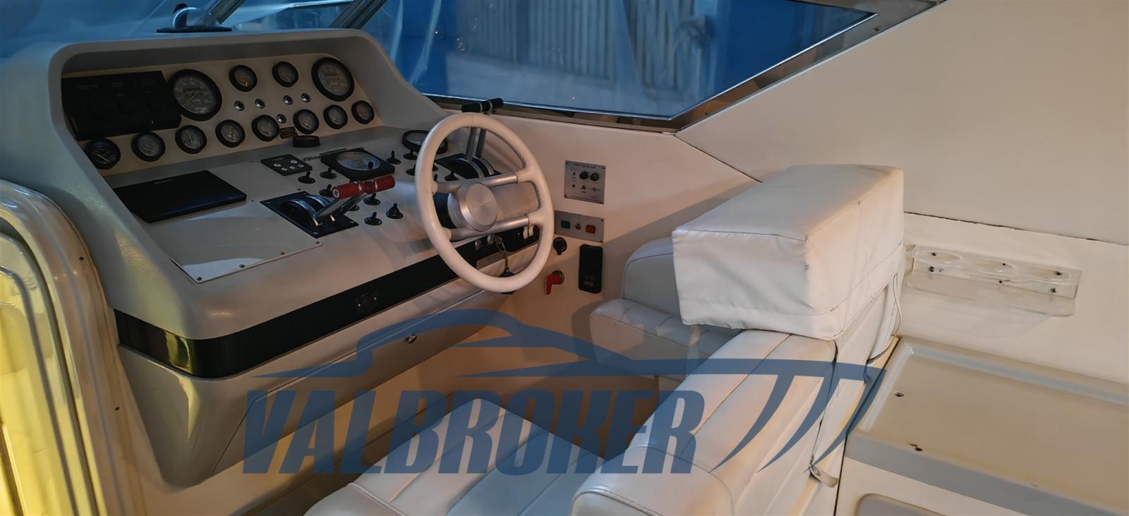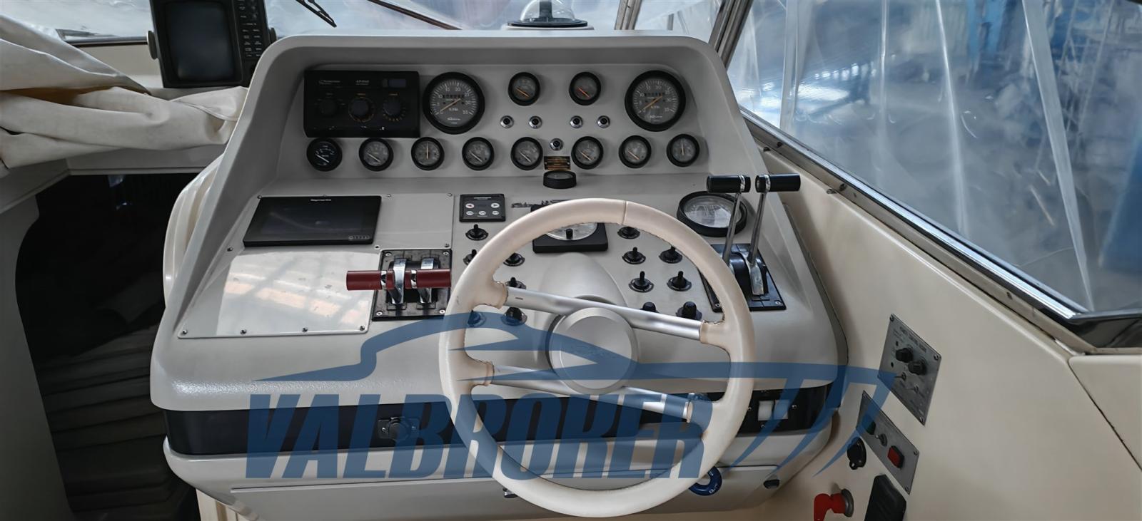 Coque puissante et solide avec de hautes remparts pour protéger le cockpit. Cabine avant et salle de bain séparée, salle à manger décapotable. De nombreuses options sont installées : climatisation, générateur, propulseur d’étrave, radar. Bateau sur la terre ferme pour le stockage hivernal.