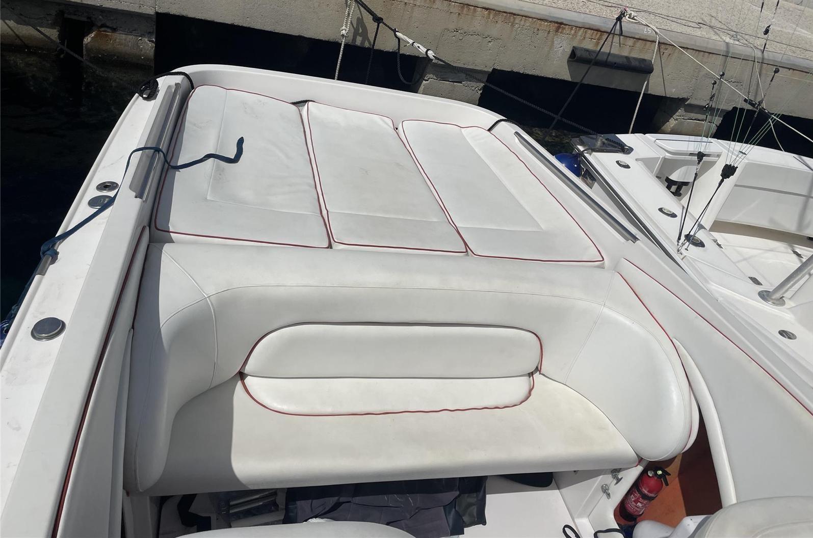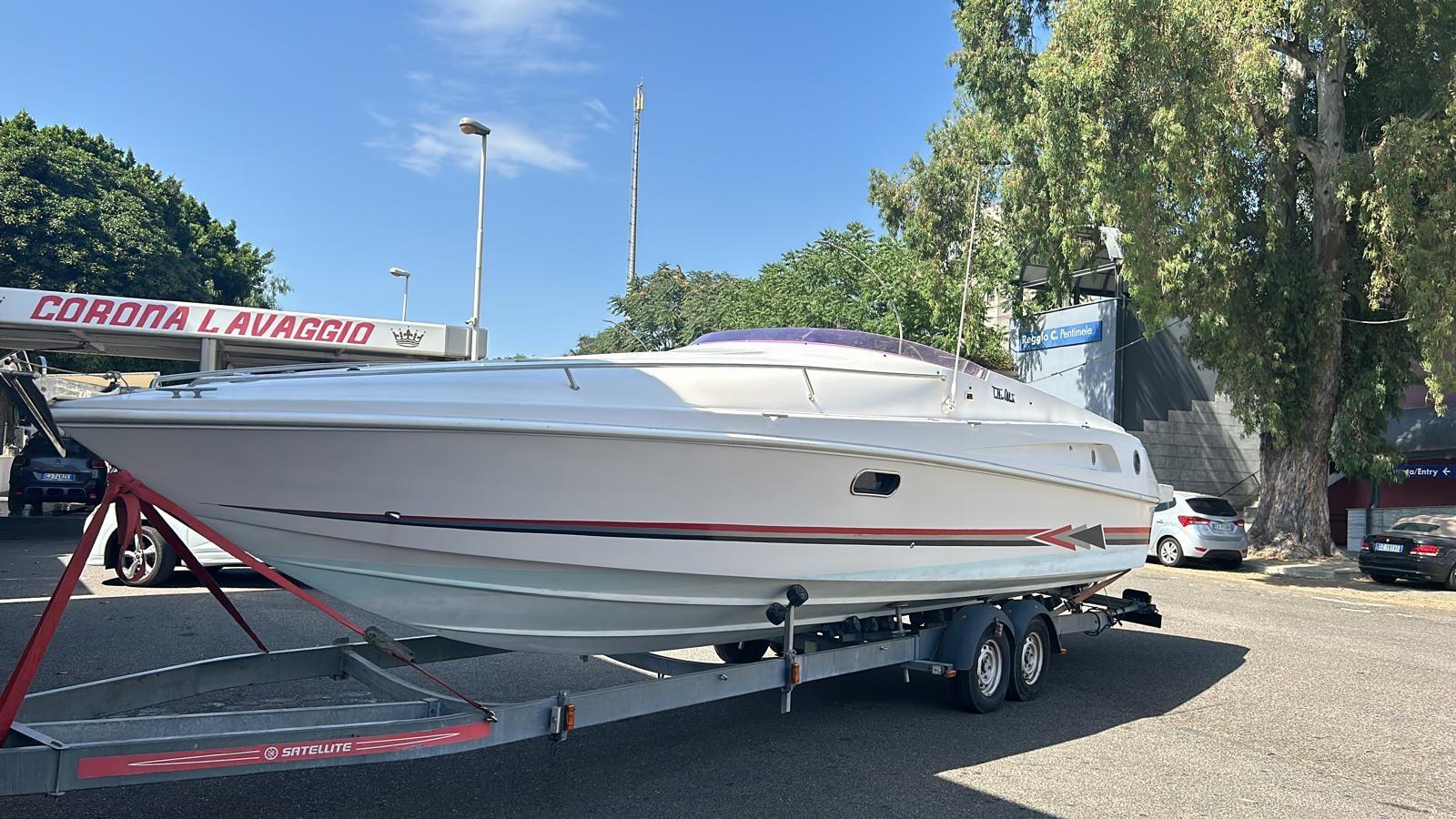 Sellerie complète, Coussins arrieres, Coussin avant, 2 Housse de bateau, Taud de soleil (in tessuto microforato con pali in acciaio).