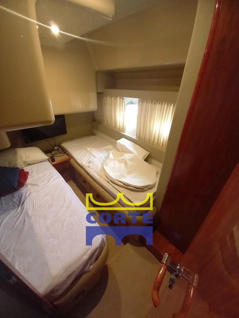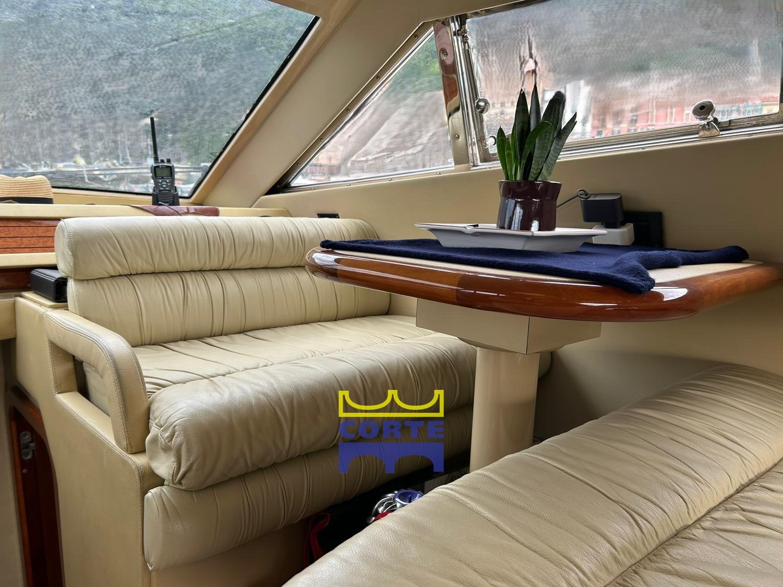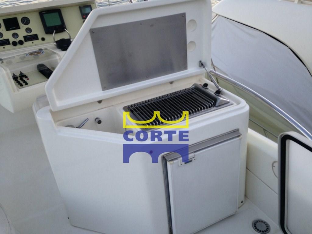 Alarme moteur, Alarme de pompe de cale, Eau sous pression, Douche de cockpit, Double barre à roue, Flaps hydrauliques, Bossoirs pour annexe (passerella), Extincteur(s) fixe(s), Spots sous-marins, Passerelle (idraulica), Plateforme arrière (di poppa allungata), Pompe de cale automatique, Porte latérale, Cockpit en teck, Prise de quai, Connexion eau sous pression à quai, Rollbar, Guindeau électrique, Echelle de bain, Corne, Winch électrique avant.