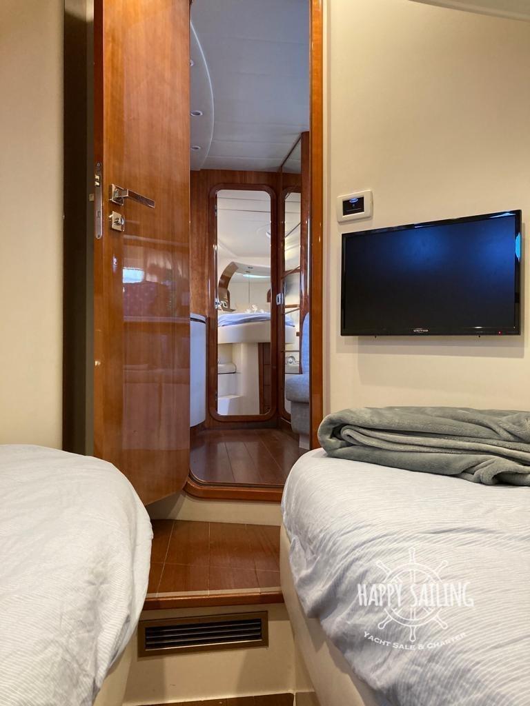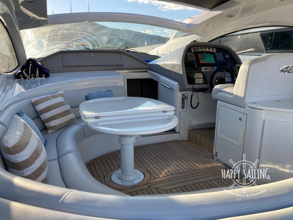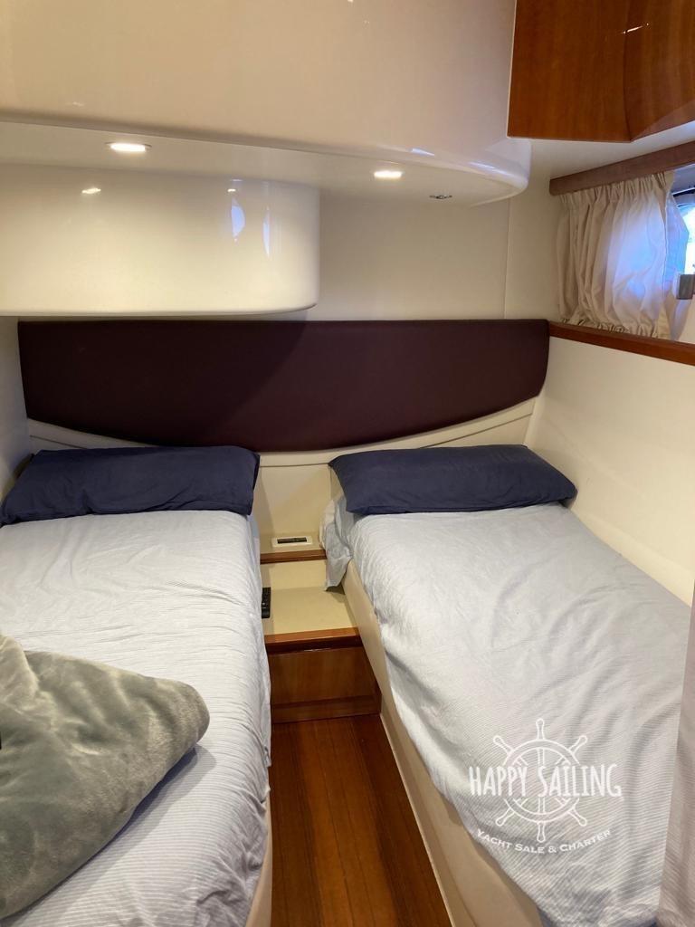Excellent bateau de croisière avec du caractère et des lignes sportives. Propulsé par 2 Mans de 800 cv qui propulsent ce bateau jusqu’à une vitesse maximale de 35 nœuds tout en conservant une excellente stabilité et habitabilité à bord. Cockpit extérieur confortable avec toit rigide, aménagement intérieur 3 cabines 2 salles de bain.