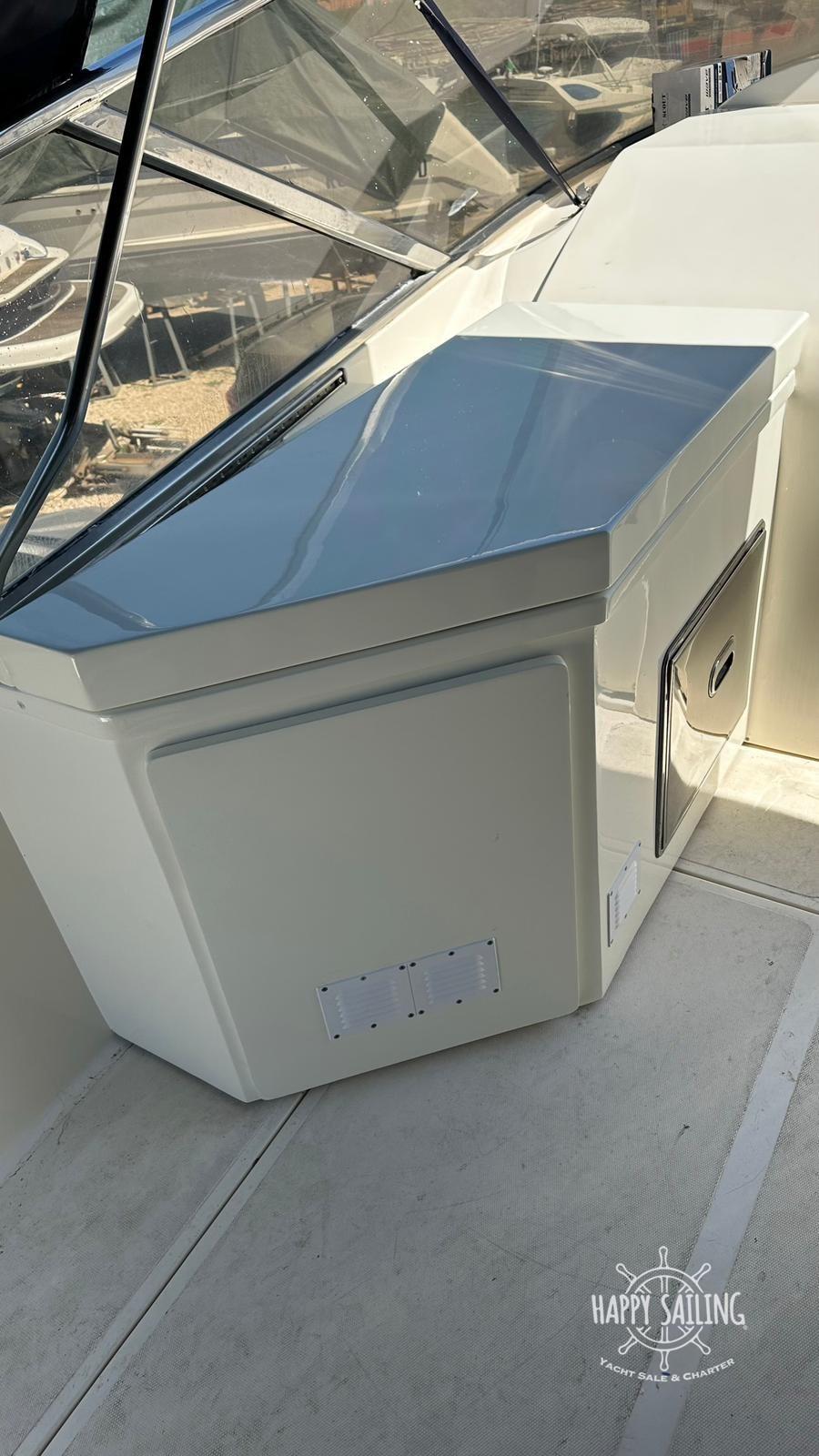 Eau sous pression, Douche de cockpit, Flaps hydrauliques, Passerelle, Plateforme arrière, Prise de quai, table de cockpit, Table pliante de salon, Annexe.