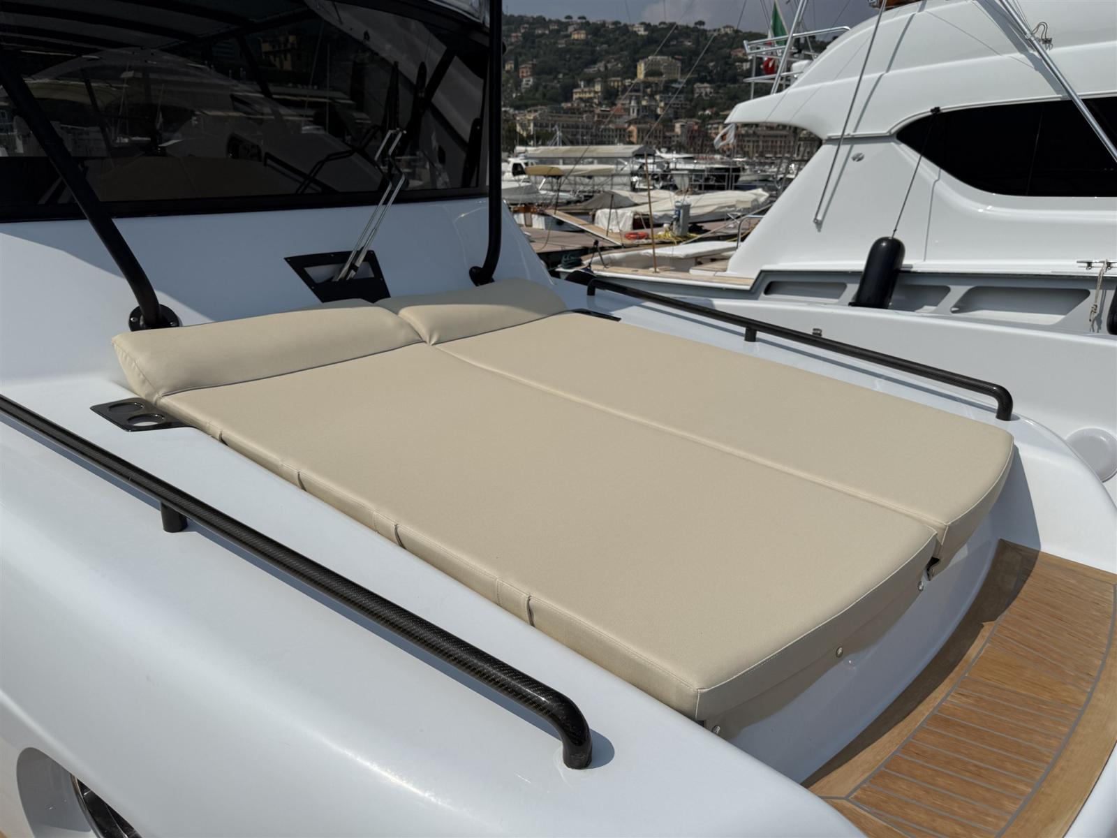 Alarme moteur, Alarme de pompe de cale, Alternateur, Ouverture du compartiment moteur électrique, Eau sous pression, Passavant en teck (SINTETICO), Douche de cockpit, Flaps électriques, Bossoirs, Lavabo dans le cockpit, Éclairage de courtoisie, Passerelle, Plateforme arrière, Pompe de cale automatique, Pompe de cale manuelle, Pont en teck (SINTETICO), Porte latérale, Cockpit en teck (SINTETICO), Prise de quai, Guindeau électrique, Echelle de bain, table de cockpit, Table pliante de salon, Corne, T-Top, Winch électrique arrière.