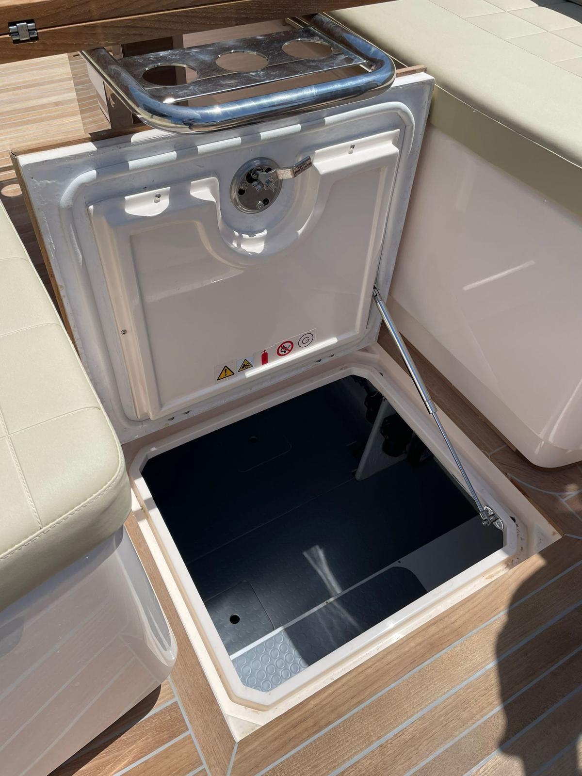 Ensemble Confort (Toit rigide en fibre de verre avec lumières LED + Réfrigérateur et Barbecue lt. 42 armoire de cockpit ; Prise d’eau de quai avec réduction de pression ; Table télescopique LLA avec plateau en bois dans le cockpit + Climatisation version 1 Compact Monobloc 7000 Btu + Générateur 5 kw