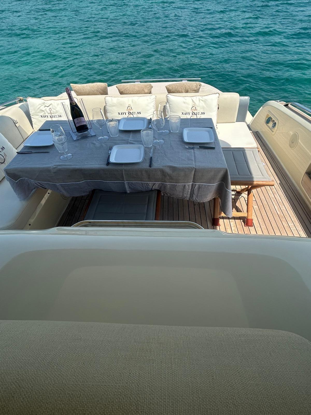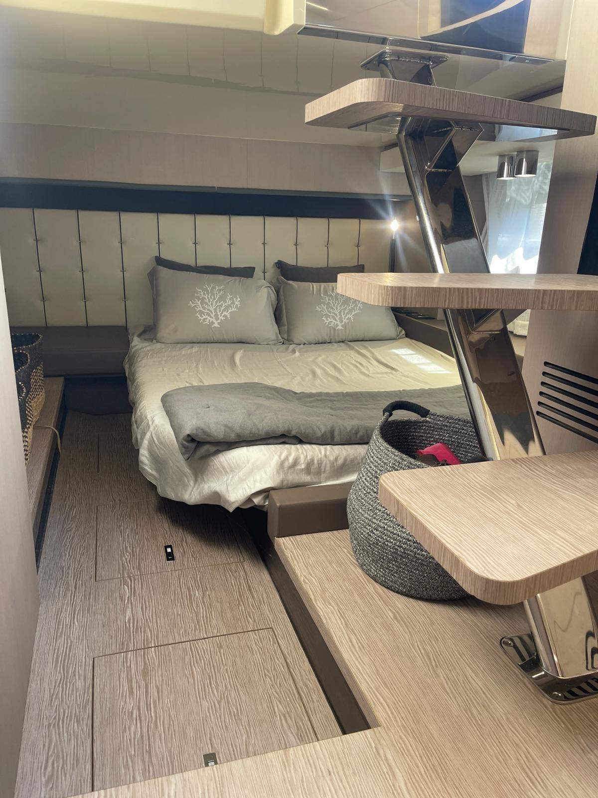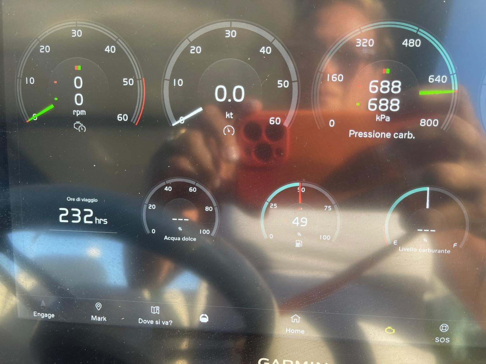 Alarme moteur, Alarme de pompe de cale, Alternateur, Eau sous pression, Câble d’alimentation à quai, Couleur spéciale (SPECTRUM BLUE), Douche de cockpit, Flaps électriques, Extincteur(s) fixe(s), Lavabo dans le cockpit, Éclairage de courtoisie, Spots sous-marins, Passerelle, Plateforme arrière, Pompe de cale automatique, Pompe de cale manuelle, Porte latérale, Cockpit en teck, Prise de quai, Guindeau électrique, Echelle de bain, table de cockpit, Corne, T-Top (CARBONIO).
